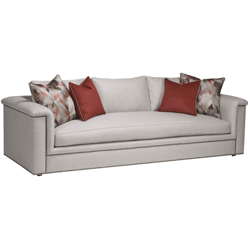 A spacious transitional sofa that exudes elegance through its design and finishes. Suitable for ample pillows and cushions that provide enhanced comfort. This particular sofa can also be customized to your preferences, from the configuration based on your available space to the fabric, wood finish, pillow fabric, base, and frame trim.