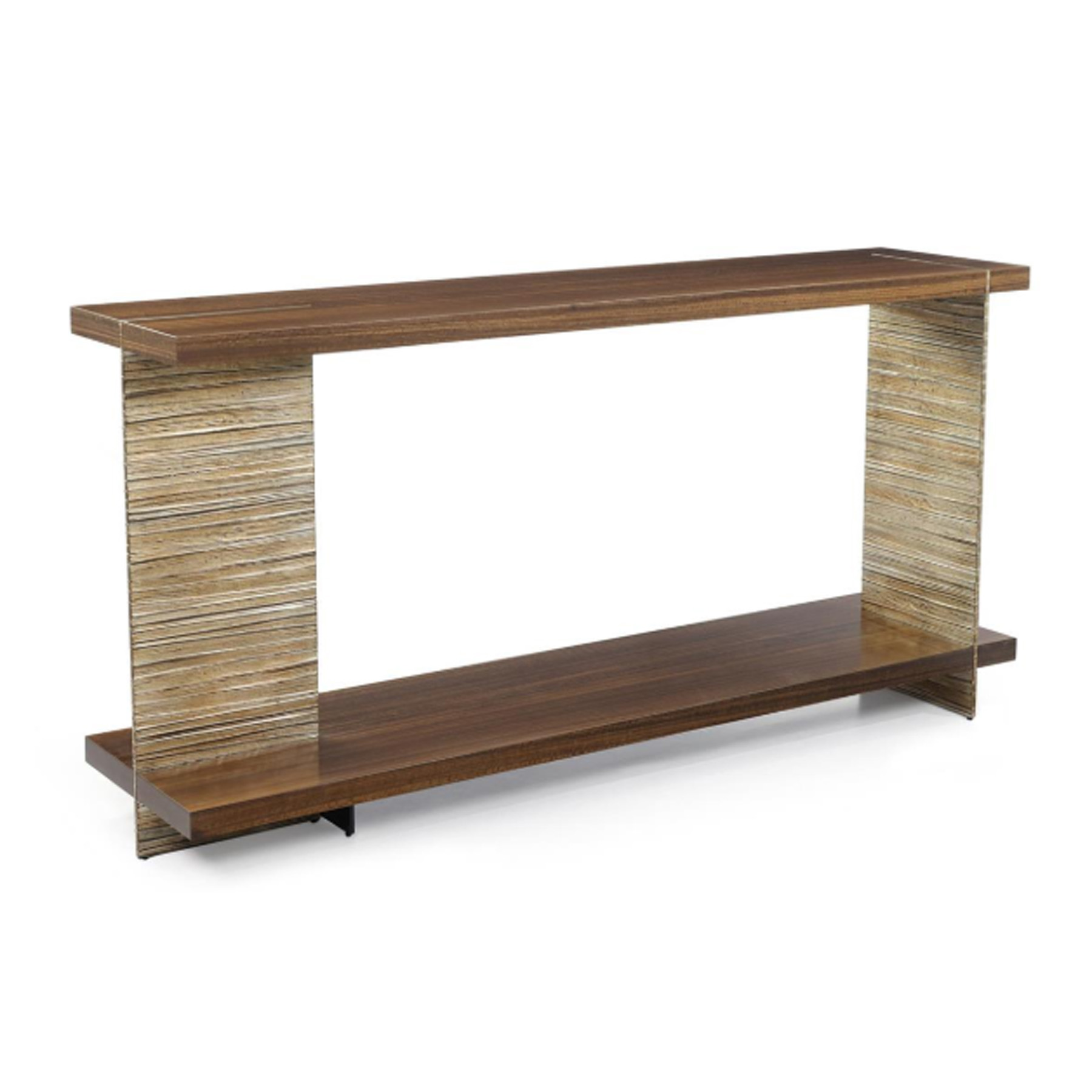 The Altillo Console Table is a gorgeous statement piece that demonstrates a stylish use of negative space. Two rectangular surfaces of Light Smoked eucalyptus wood are separated by two textural steel legs in a Rose Silver finish, creating a stylish juxtaposition between natural and metallic tones. The legs are affixed at perpendicular angles to result in a dynamic, asymmetric look that elevates an interior space.