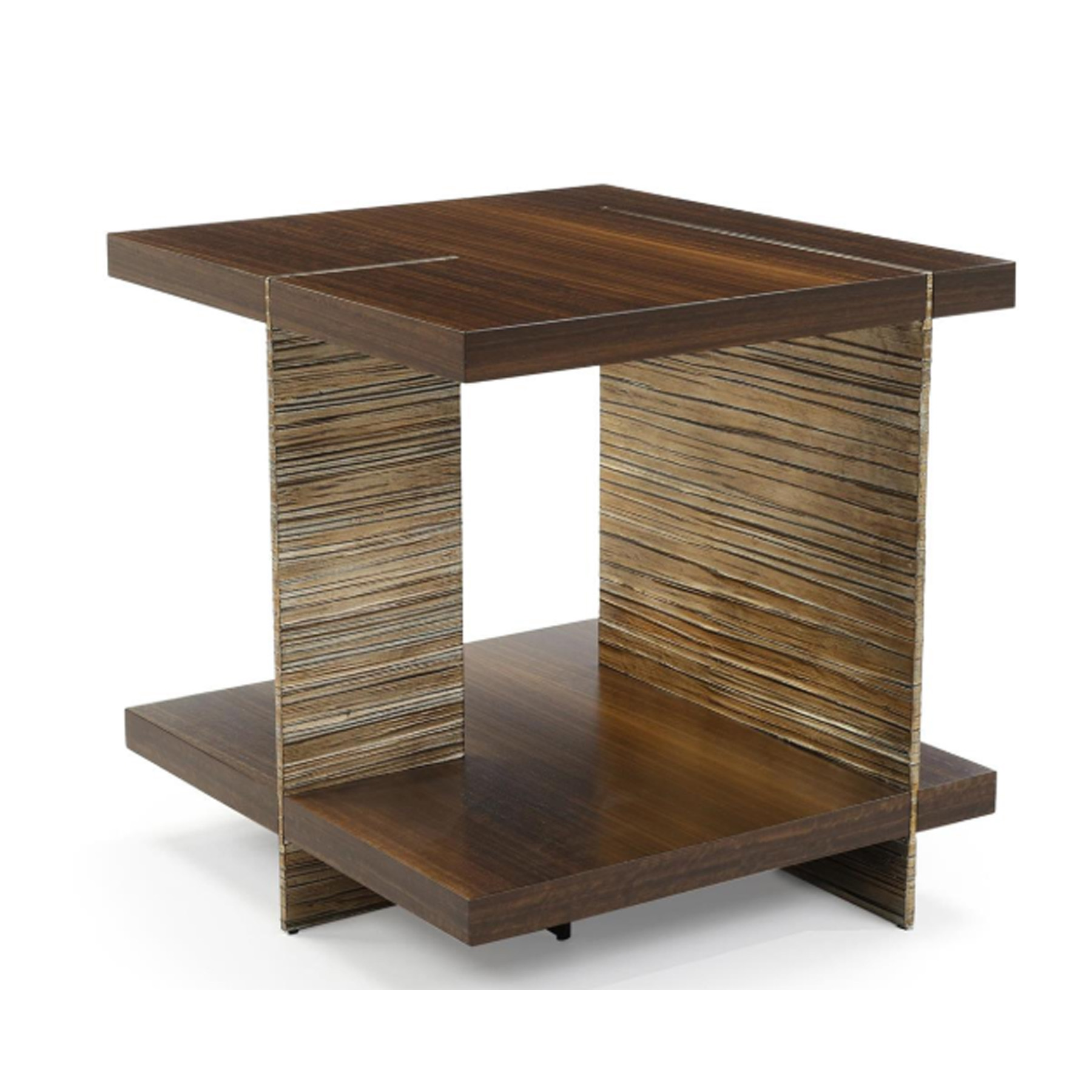 The Altillo End Table is a gorgeous statement piece that demonstrates an innovative use of negative space. Dual layers of Light Smoked eucalyptus wood are separated by two textural steel legs in a Rose Silver finish, creating a stylish juxtaposition between natural and metallic tones. The legs are affixed at perpendicular angles to result in a dynamic, asymmetric look that elevates an interior space.