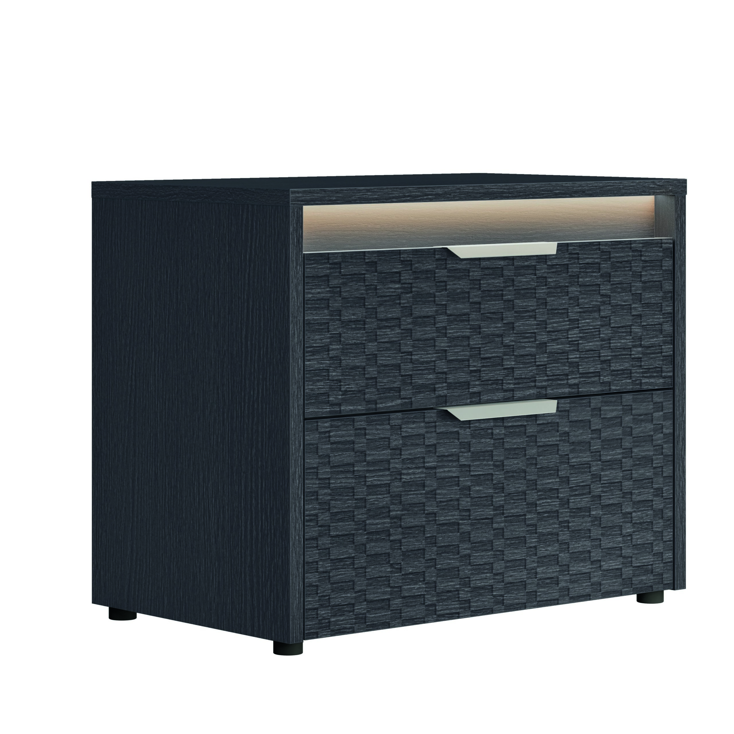 The nightstands, with Tetris-textured drawer fronts and top-edge lighting, complete the look, adding modern elegance to any bedroom.