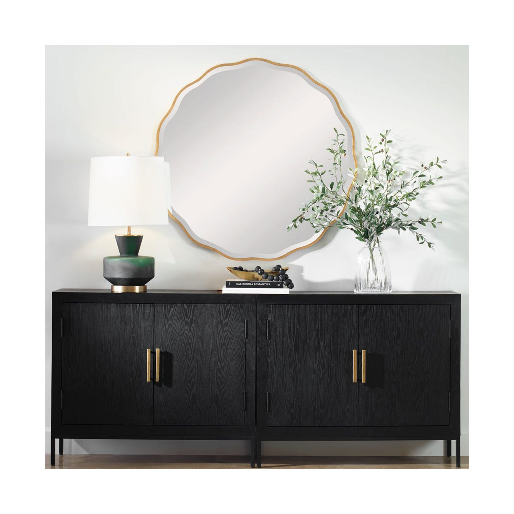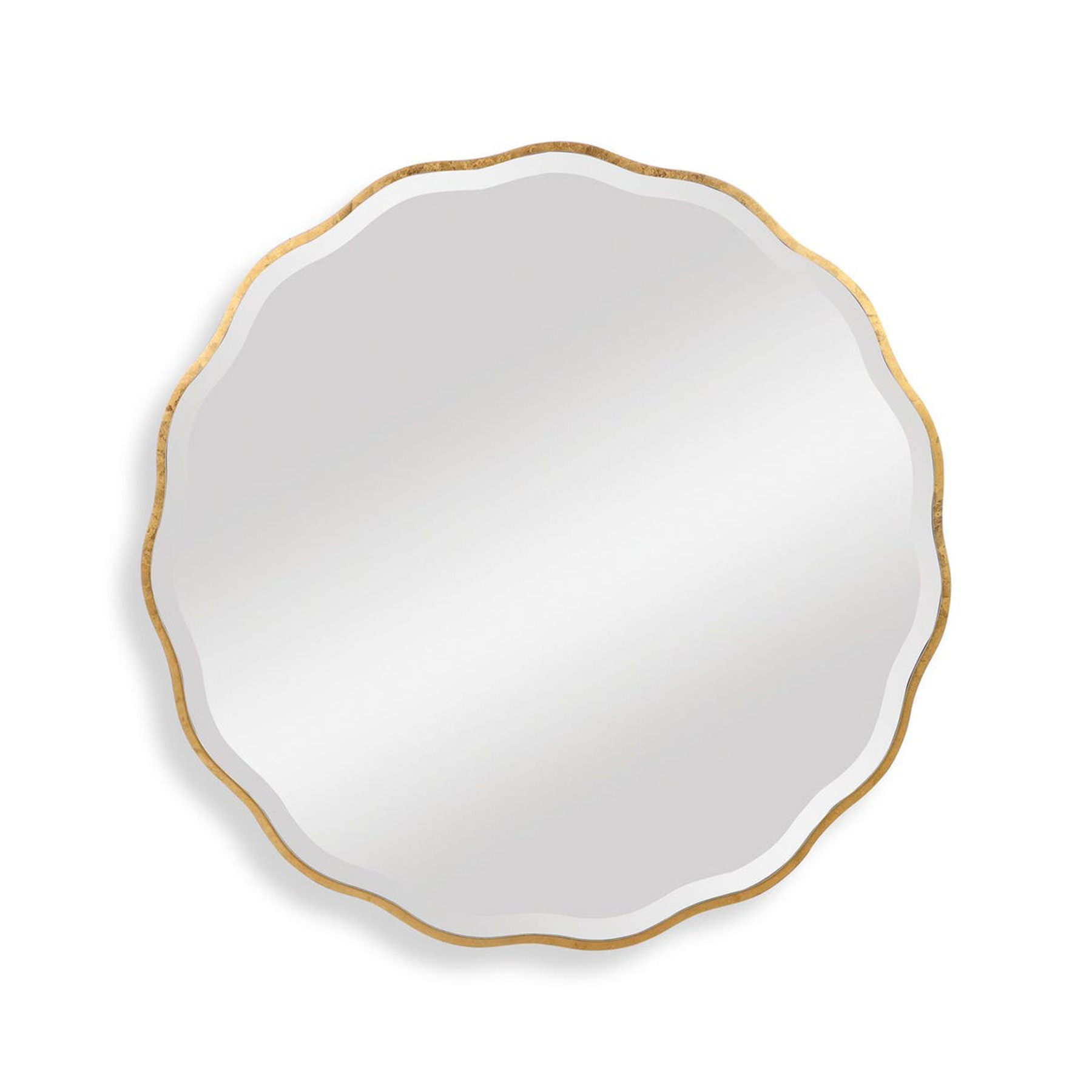Showcasing a feminine scalloped edge, this shaped wood mirror adds whimsical flair to any design. The mirror is finished in an antiqued gold leaf, and has a 1″ bevel.