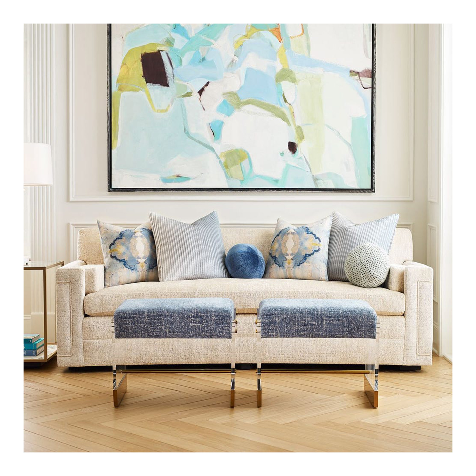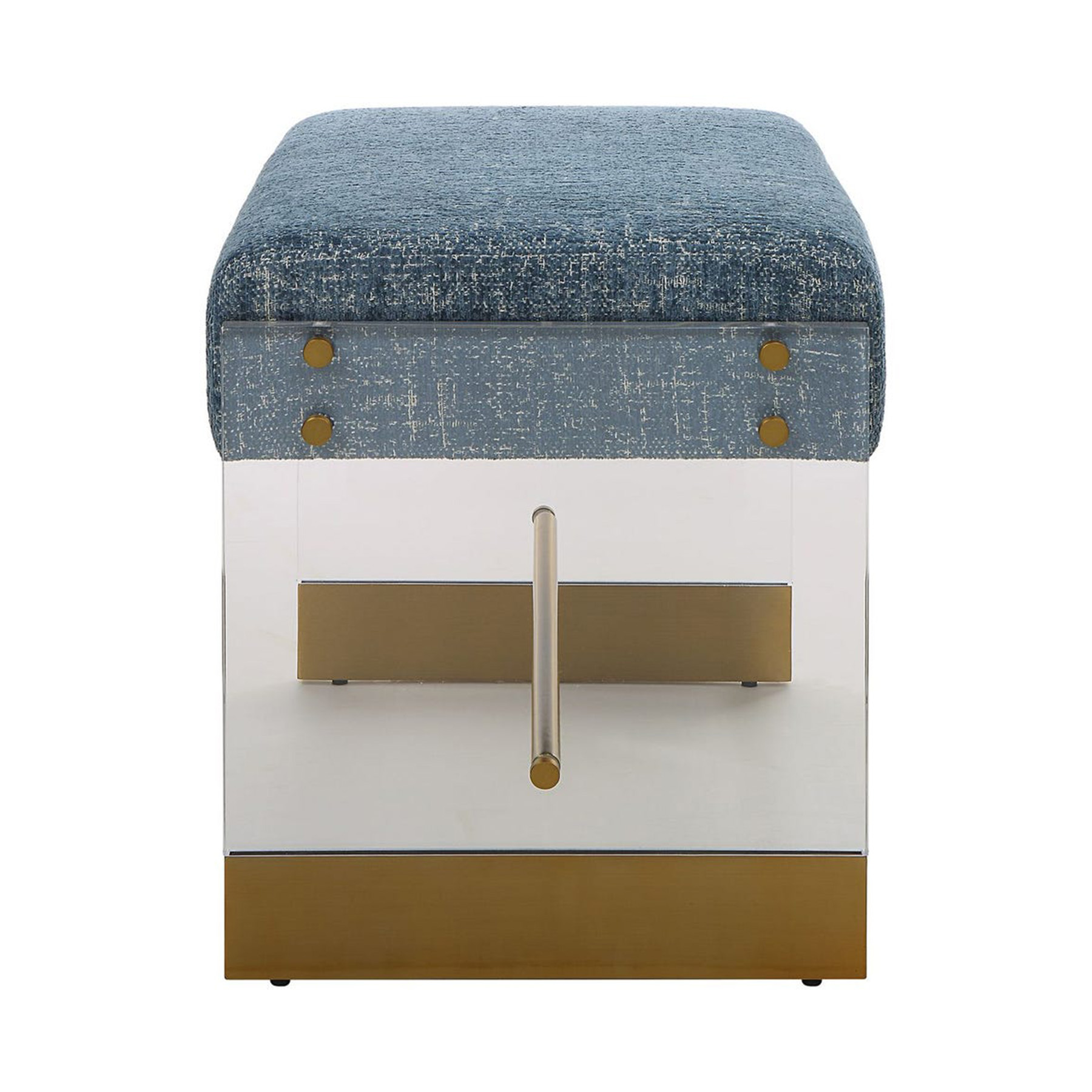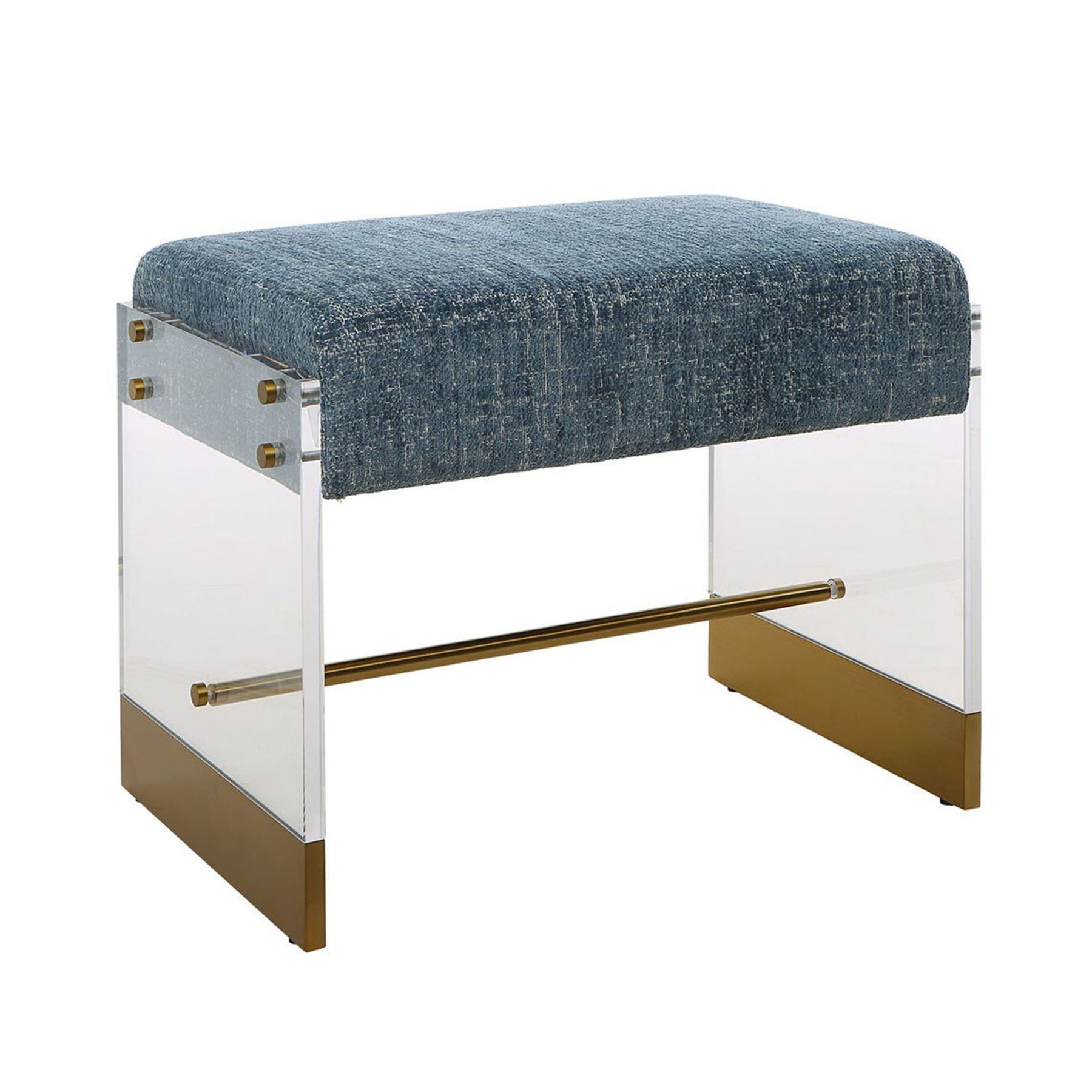 A luscious, plush aqua-and-white fabric seems to float in mid air, supported by jewel-like acrylic legs. The stainless steel leg bases, bolts, and stretcher have been finished in brushed antique brass. The bench is made with performance fabric, to resist staining, and its waterfall edge creates a crisp, clean look.