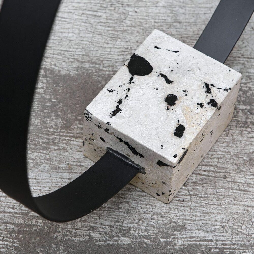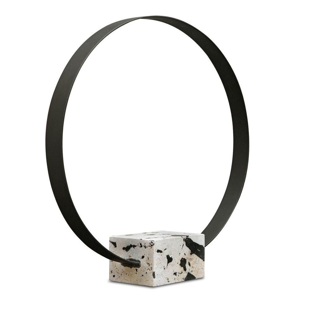 This circular metal sculpture is finished in a brushed satin black anchored by a natural white coral stone base with black accents.