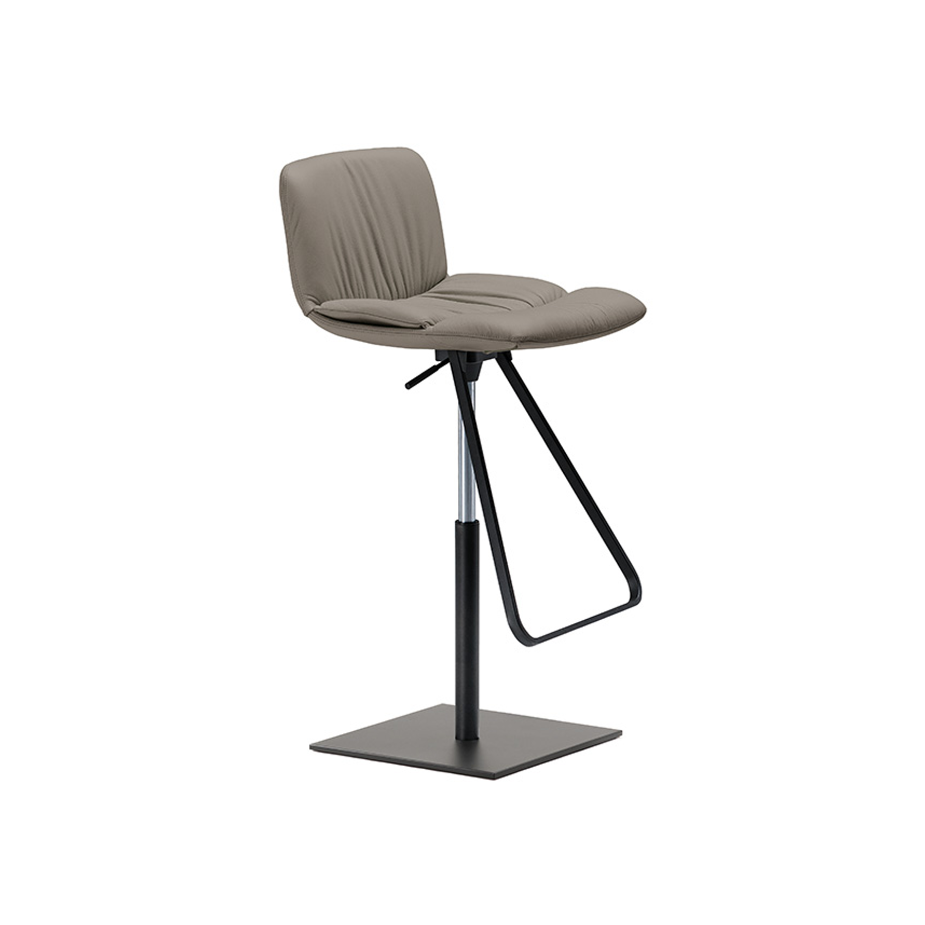 Swiveling and adjustable height stool with satin stainless steel base plate and column, footrest and gas piston in chromed steel or with base plate, column, and footrest in black embossed lacquered steel and gas piston in chromed steel. Frame covered in fabric, synthetic leather or soft leather as per sample card.