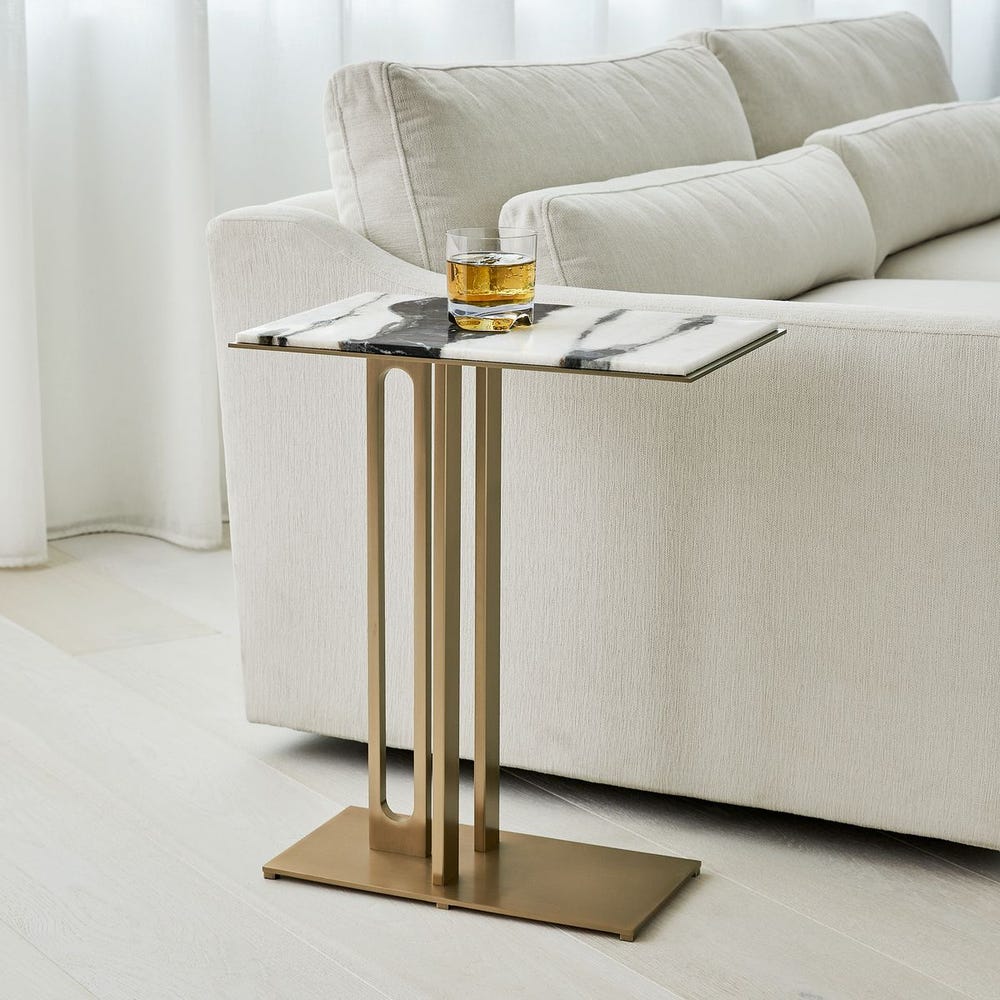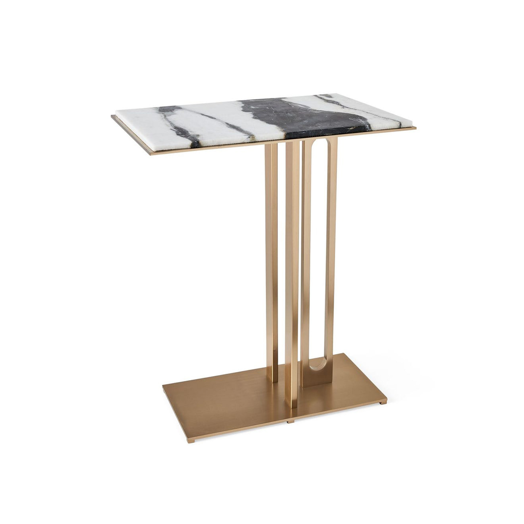 A balance between function and beauty. Panda marble rests atop a metal top, body and base in rich brass finish. Perfect to pull up to your favorite seat and rest a beverage. Due to the nature of natural stone, each piece will vary in color and veining, including shades of black, white and green.
