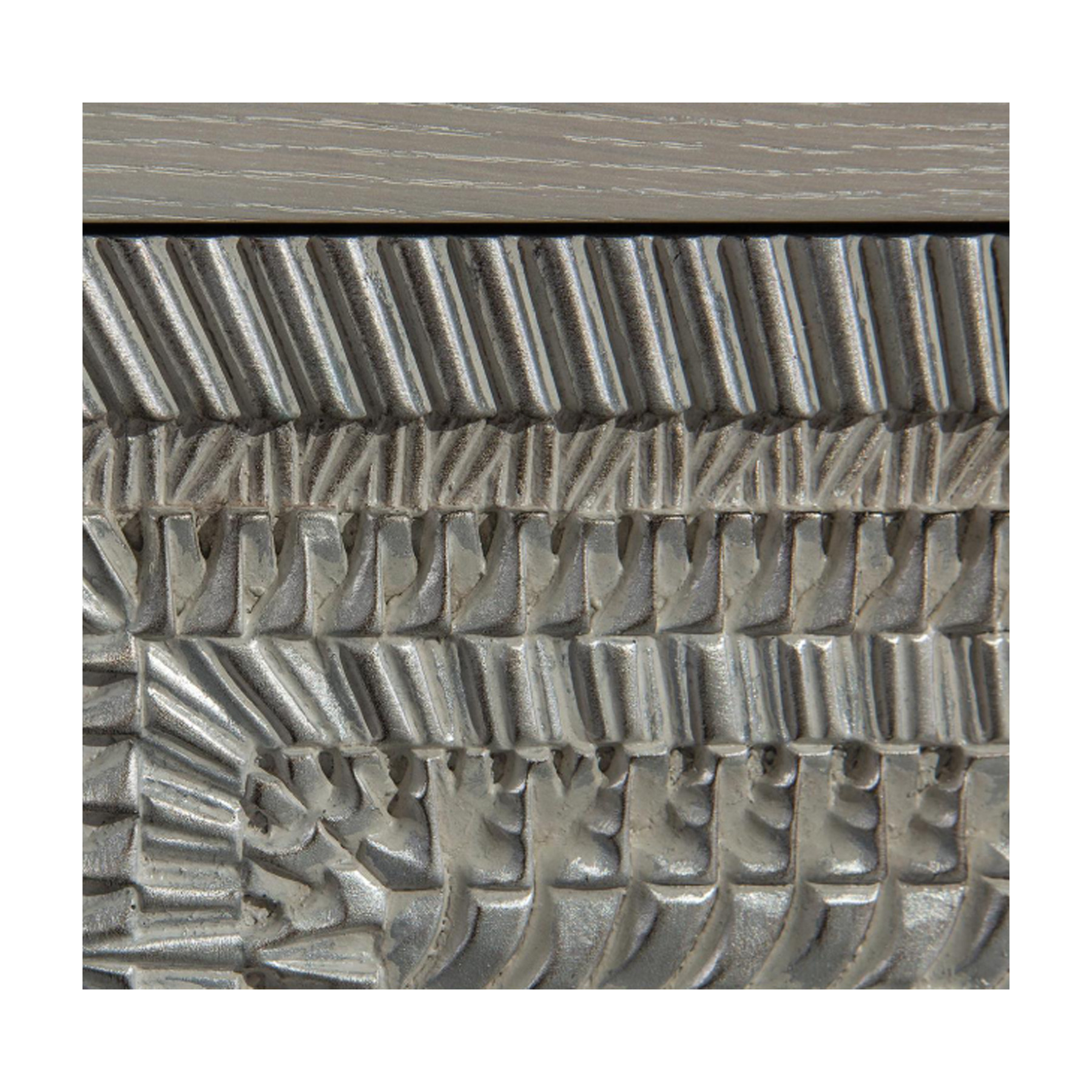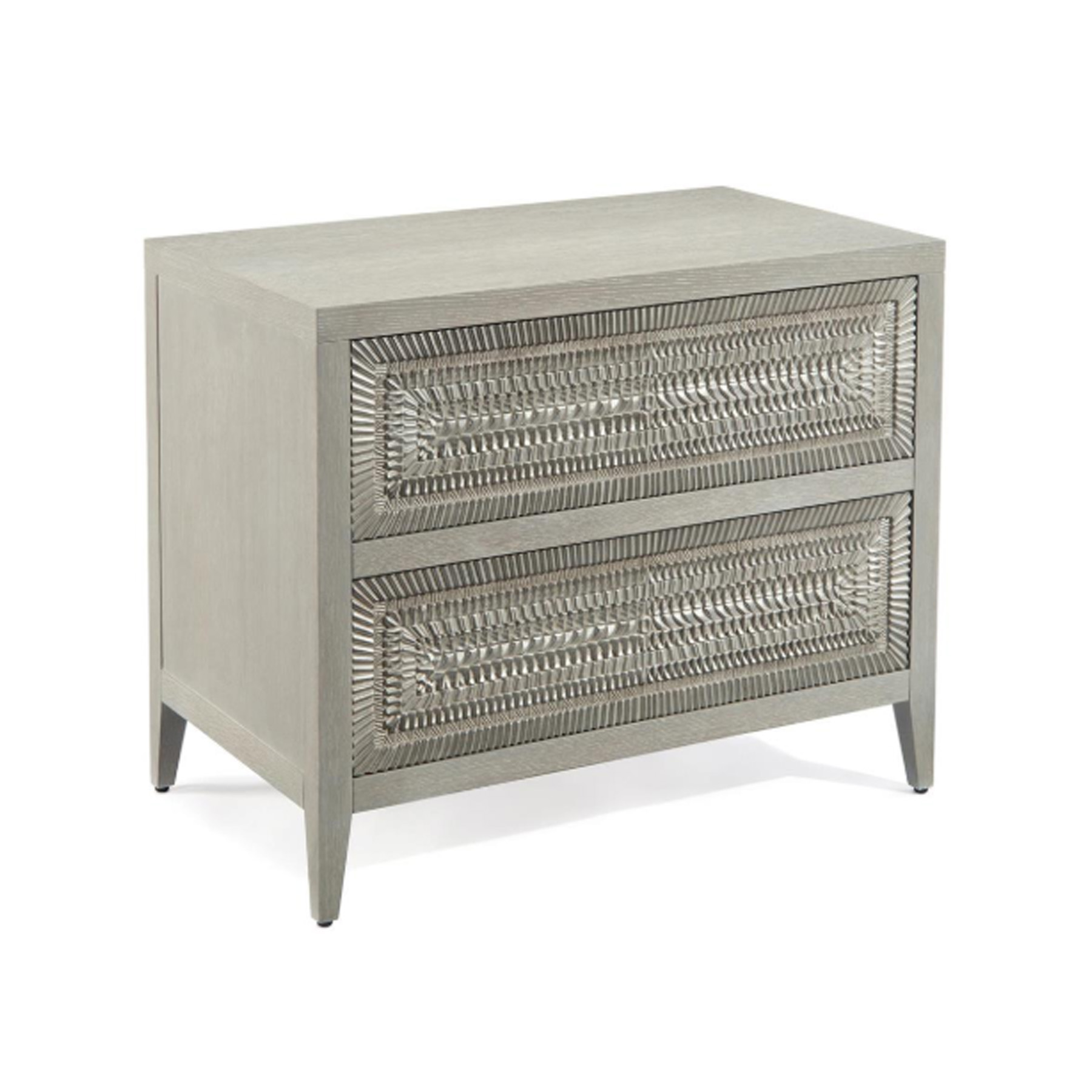 This two-drawer nightstand has drawer fronts with a Silver White, radiating pattern. They are set in a grey oak case.