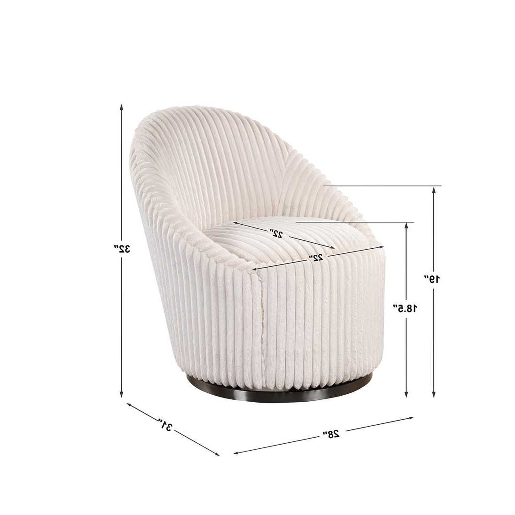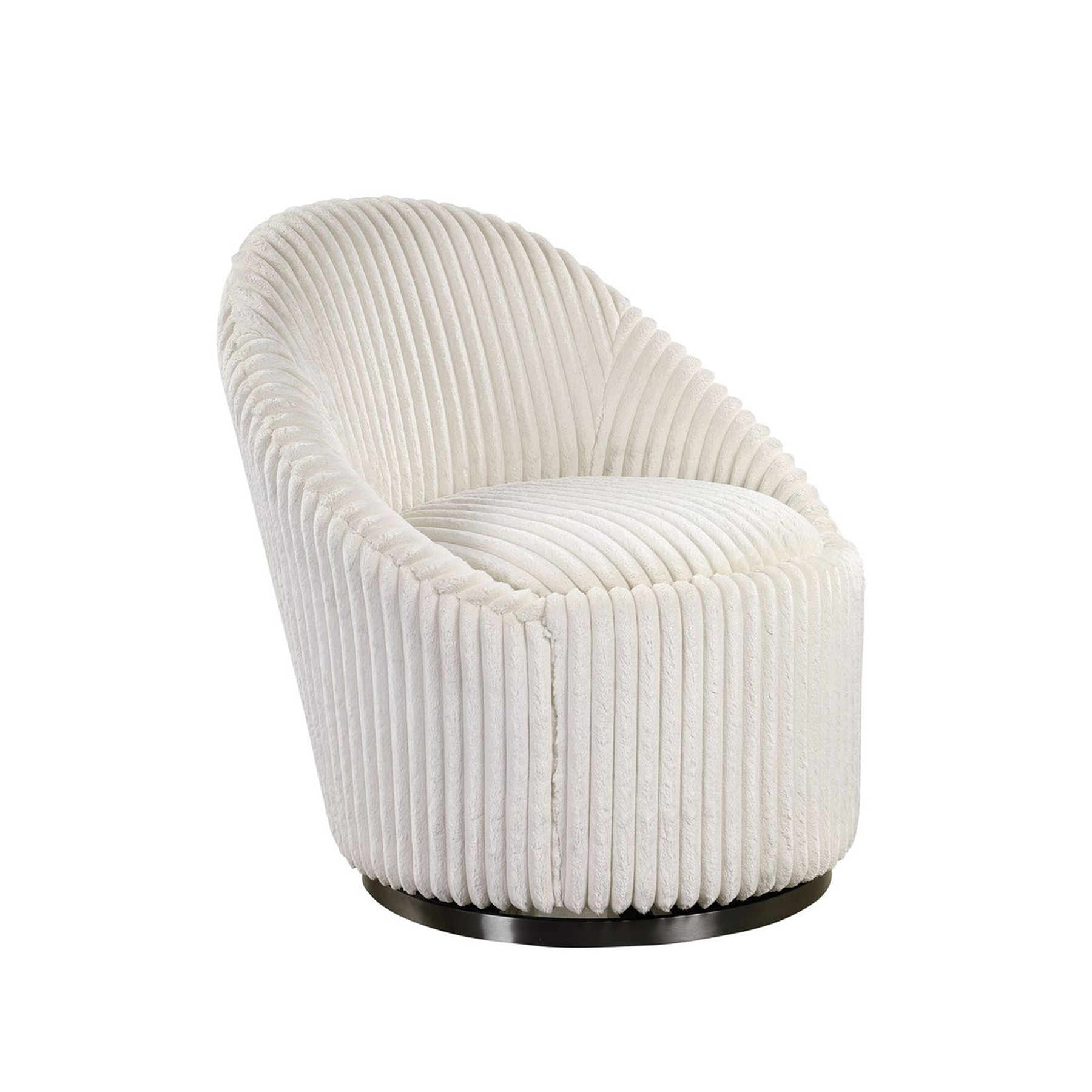 A blend of contemporary and feminine styles, this chair is upholstered in a luxurious fluted ivory chenille fabric and is accented by a stainless steel swivel base finished in brushed black nickel.
