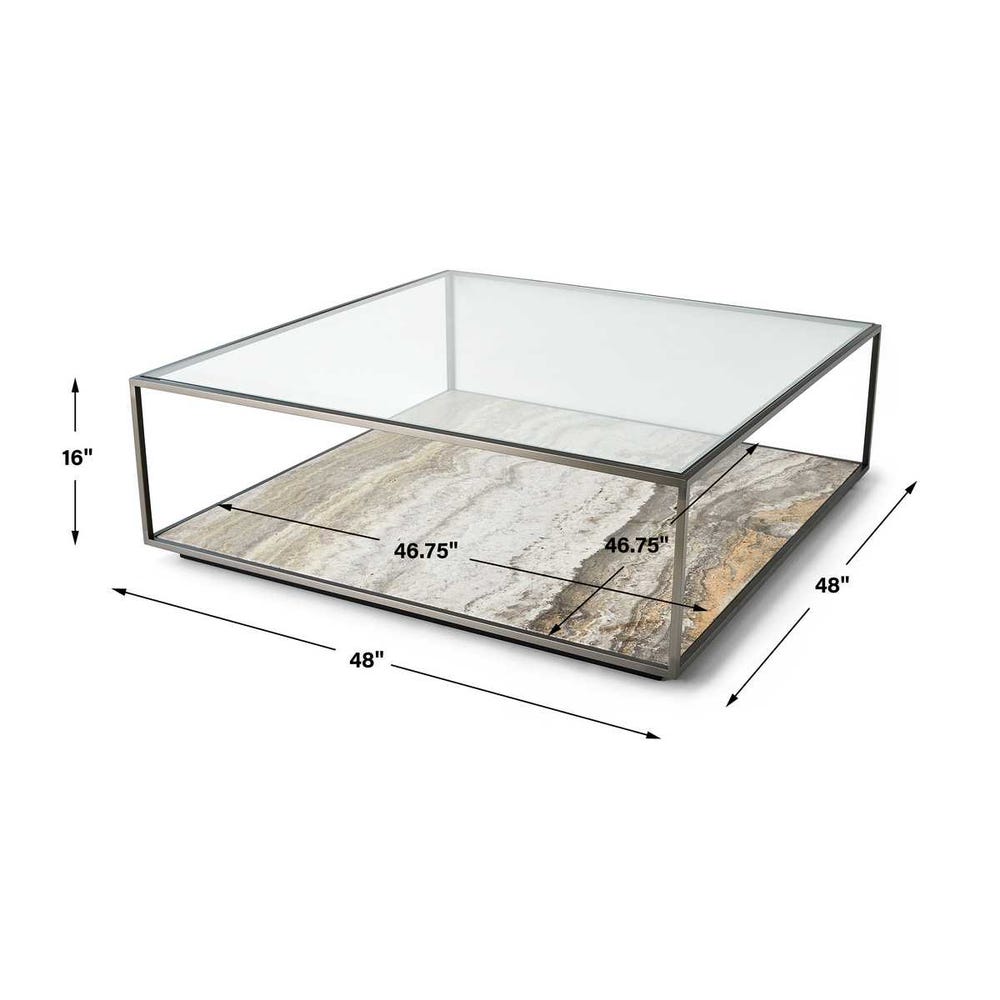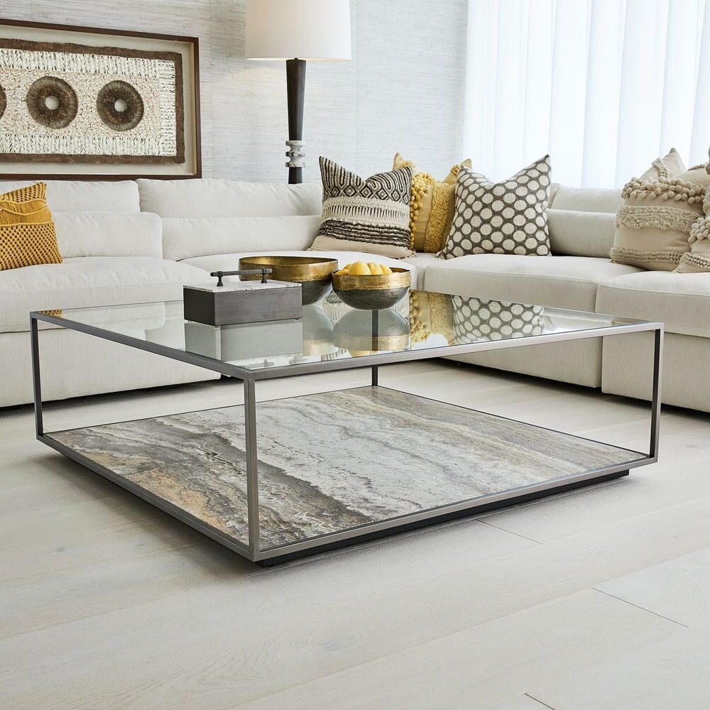 The large plane of gray travertine is balanced with lightness, suspending a clear glass top within a steel frame in a dark bronze finish. A metal plinth base gives the further appearance of floating. True to the nature of natural materials, each piece will have unique marbling and veining throughout.