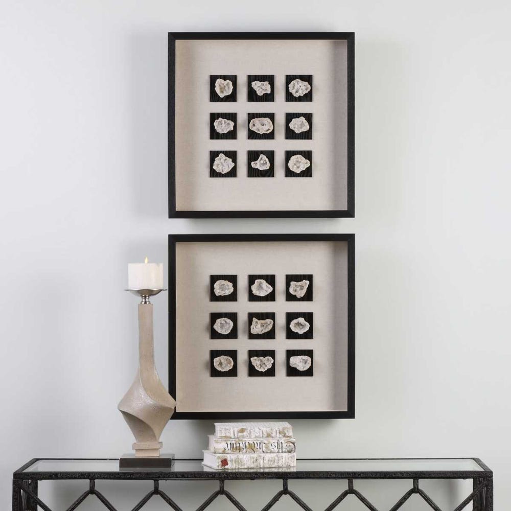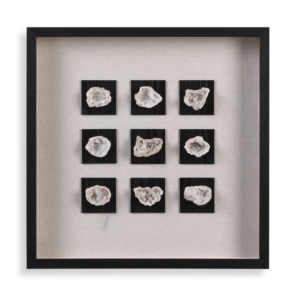 Authentic geodes in natural hues are displayed on black woodgrain matting atop a natural linen mat. A black, fir wood shadow box frame completes the display. Sizes and shapes of geodes may vary slightly.