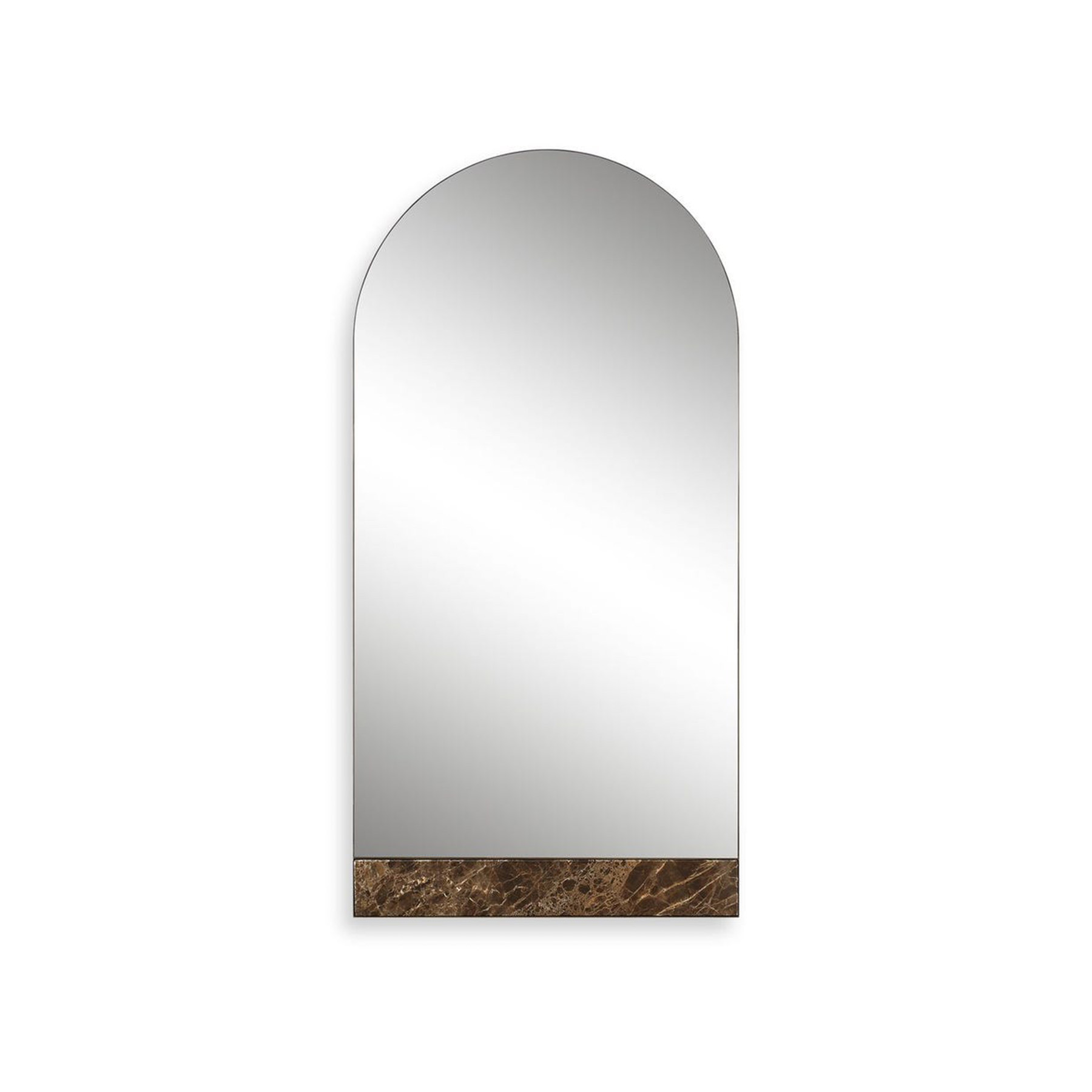 This oversized arch mirror features a thick dark bronze iron frame, complemented with an Emperador brown marble slab with subtle beveled edges.