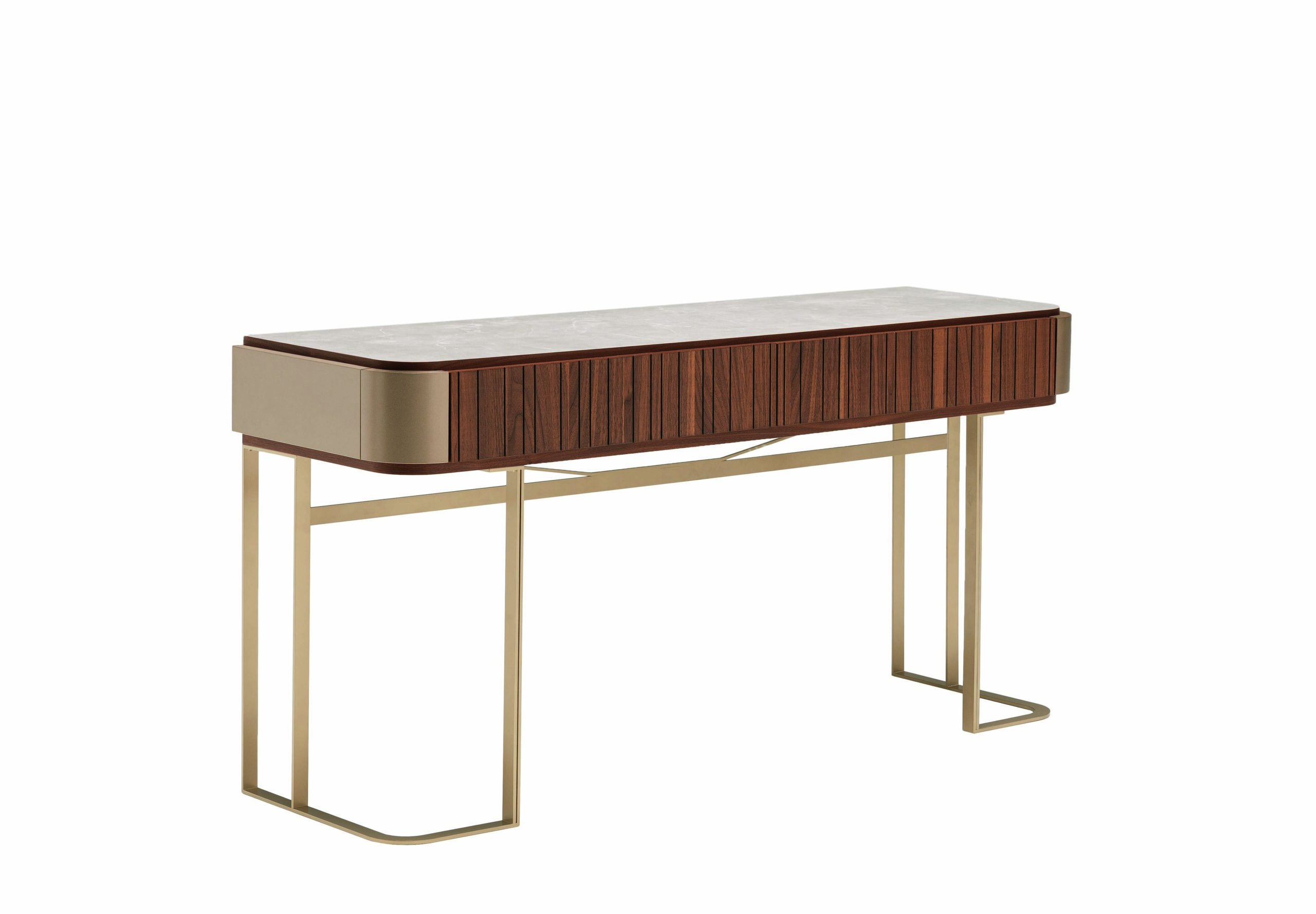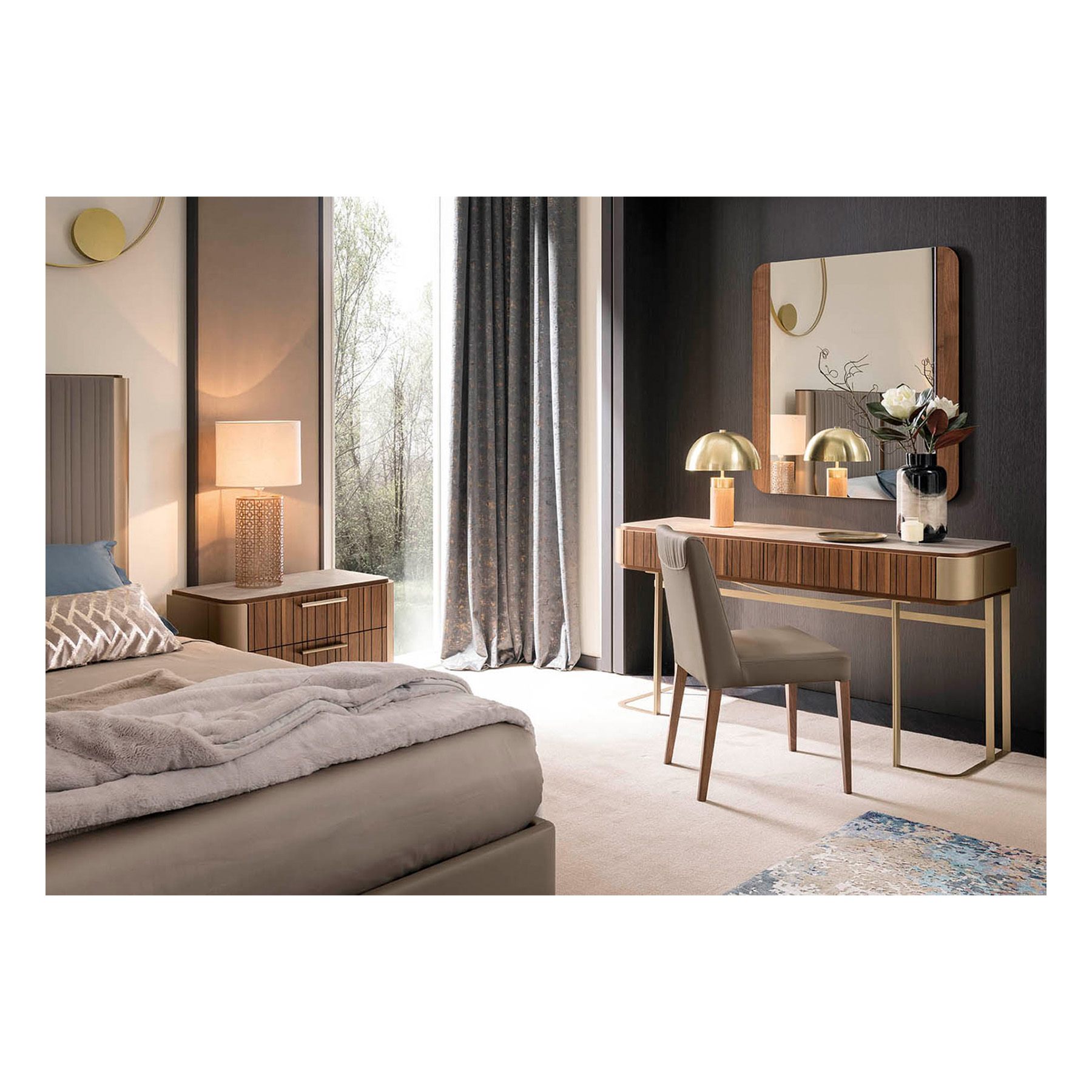 The desk, featuring Eco Stone Botticino tops and Gold lacquer frames, is an exquisite space for your grooming routine, offering a harmonious blend of beauty and practicality for your bedroom.