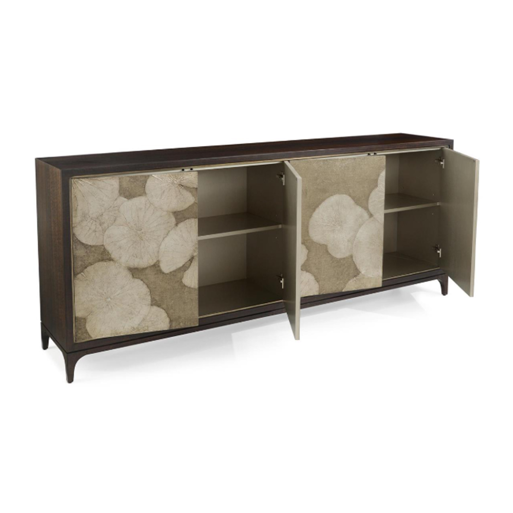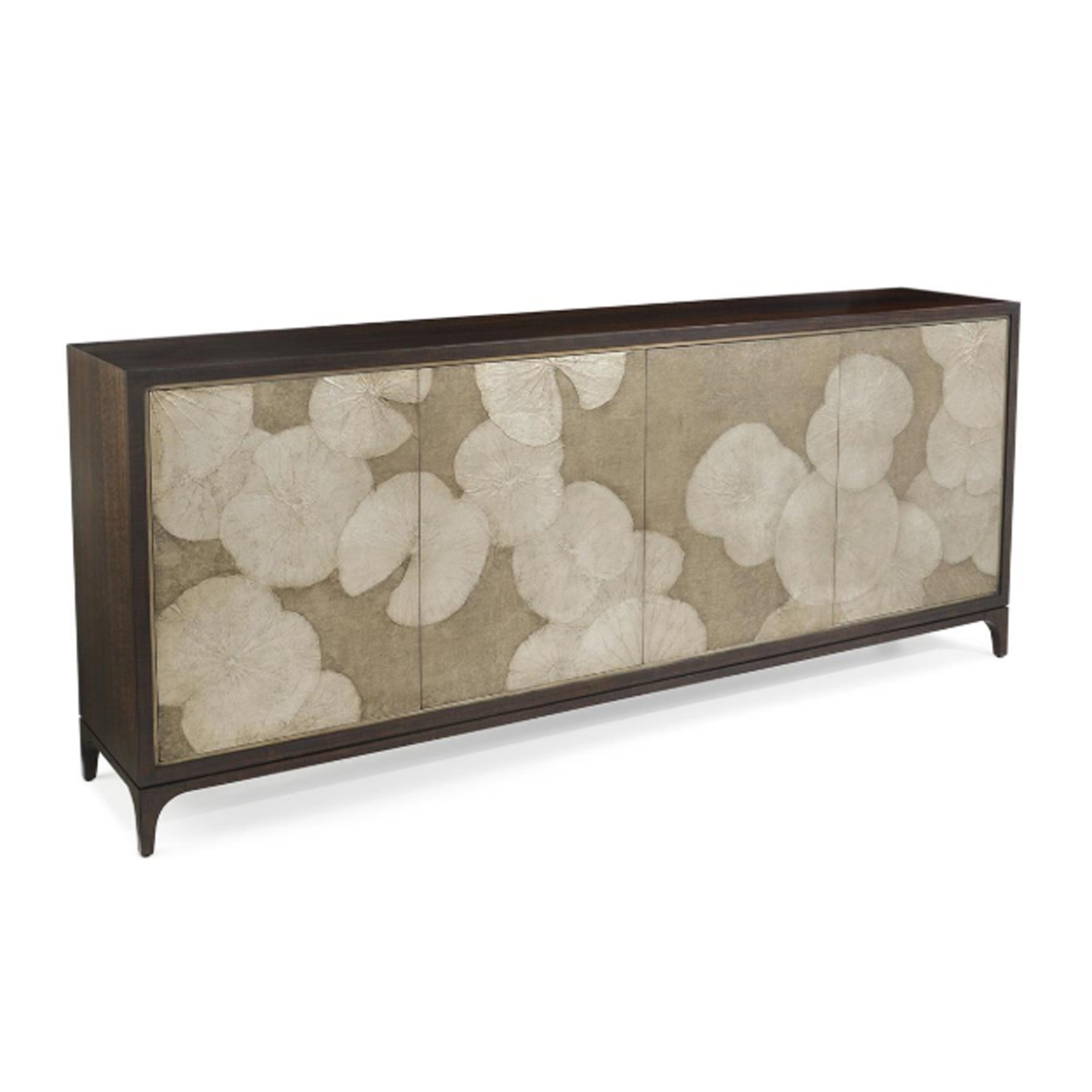 The Itadori Credenza features modern floating lotus leaves in our new lotus silver finish. The lotus are on placed on top of stunning hand finished door panels. This piece is wrapped in smoked eucalyptus and the four-doors are completed with push latches and European hinges.