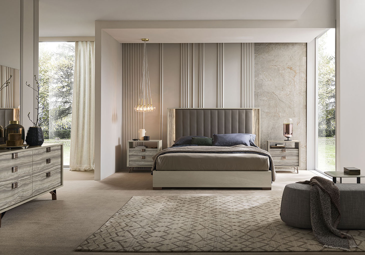 The bed, available in Queen size, King size, California size, 160 size, 180 size, stands out for the padded headboard and Eco Stone finish with accent lighting to the side.