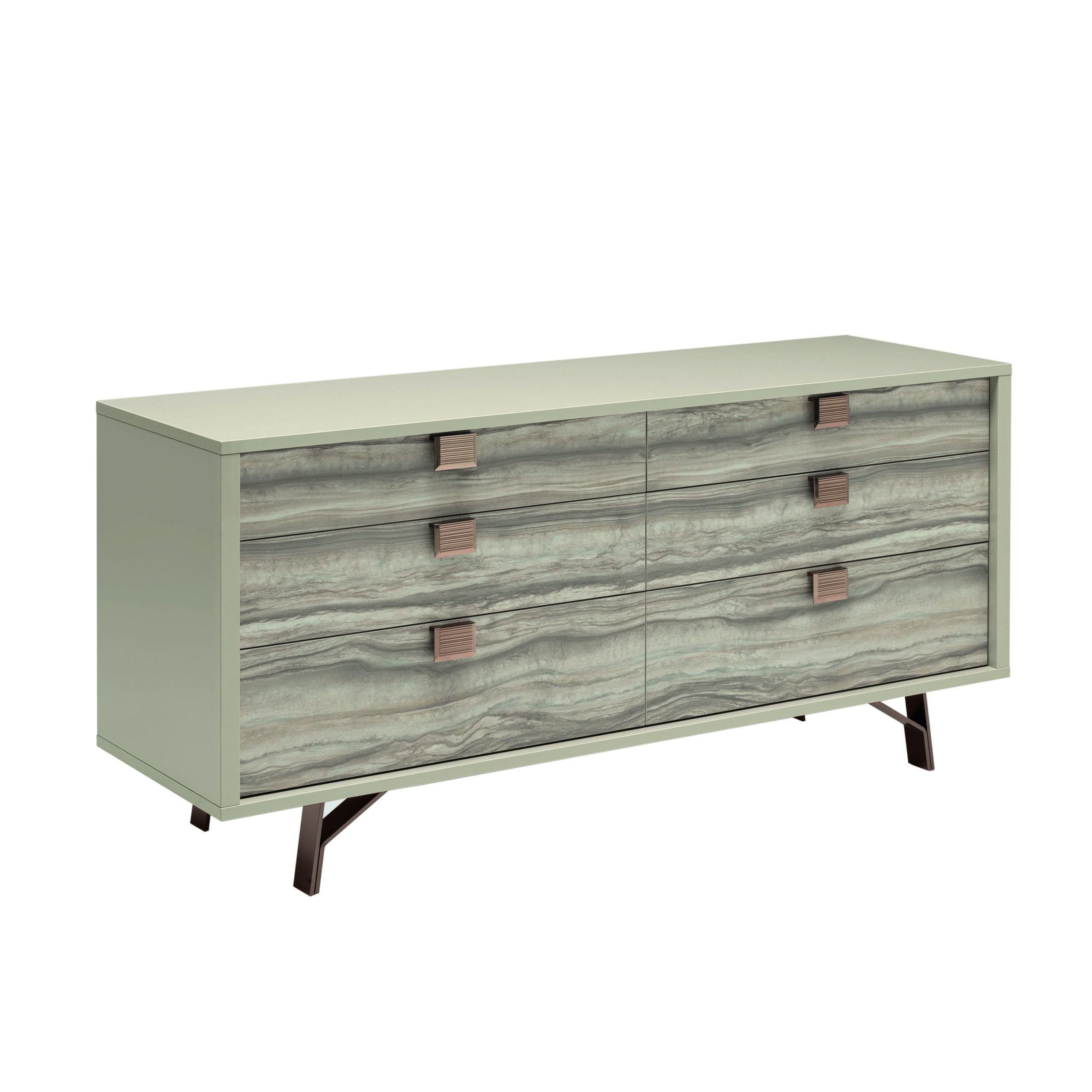 The combination of two one finishes defines the style of this collection. Pearl Eco Veneer and natural wood finish simply look stunning. The Dresser features a soft-closing mechanism.