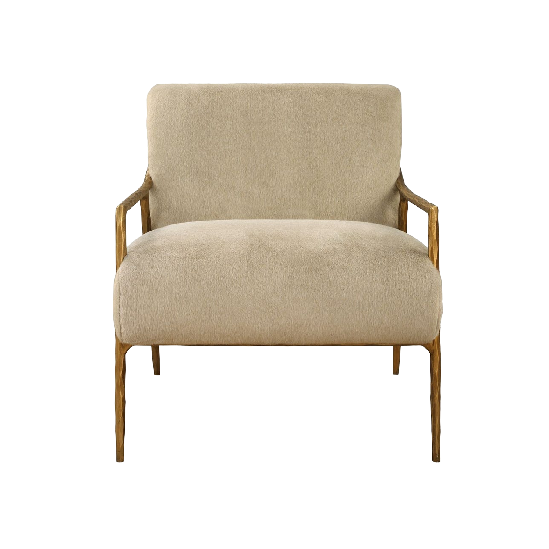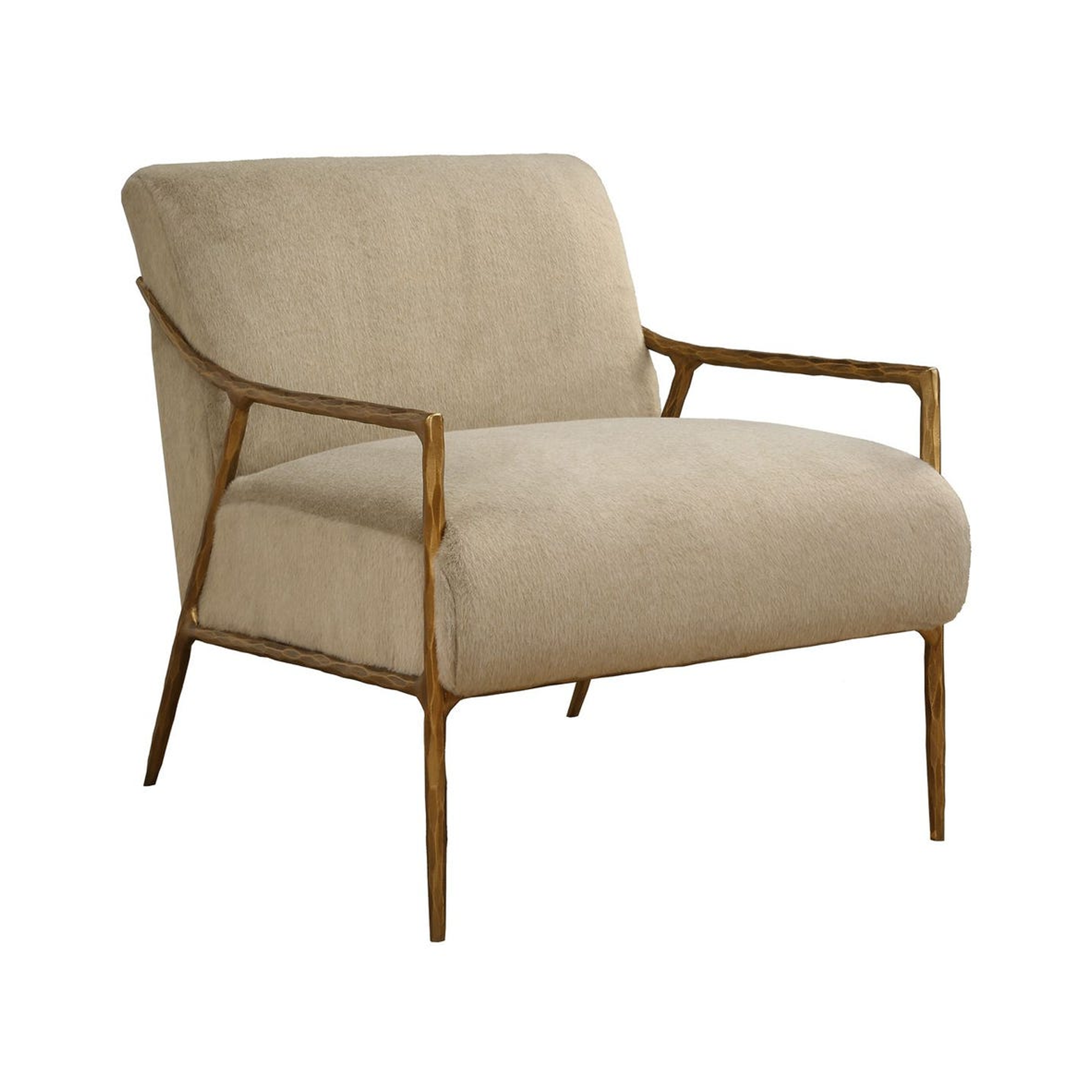 Statement-making, gently sloped track arms in hand forged chiseled iron are finished in aged gold, supporting an inviting seat upholstered in a soft fawn toned faux fur.