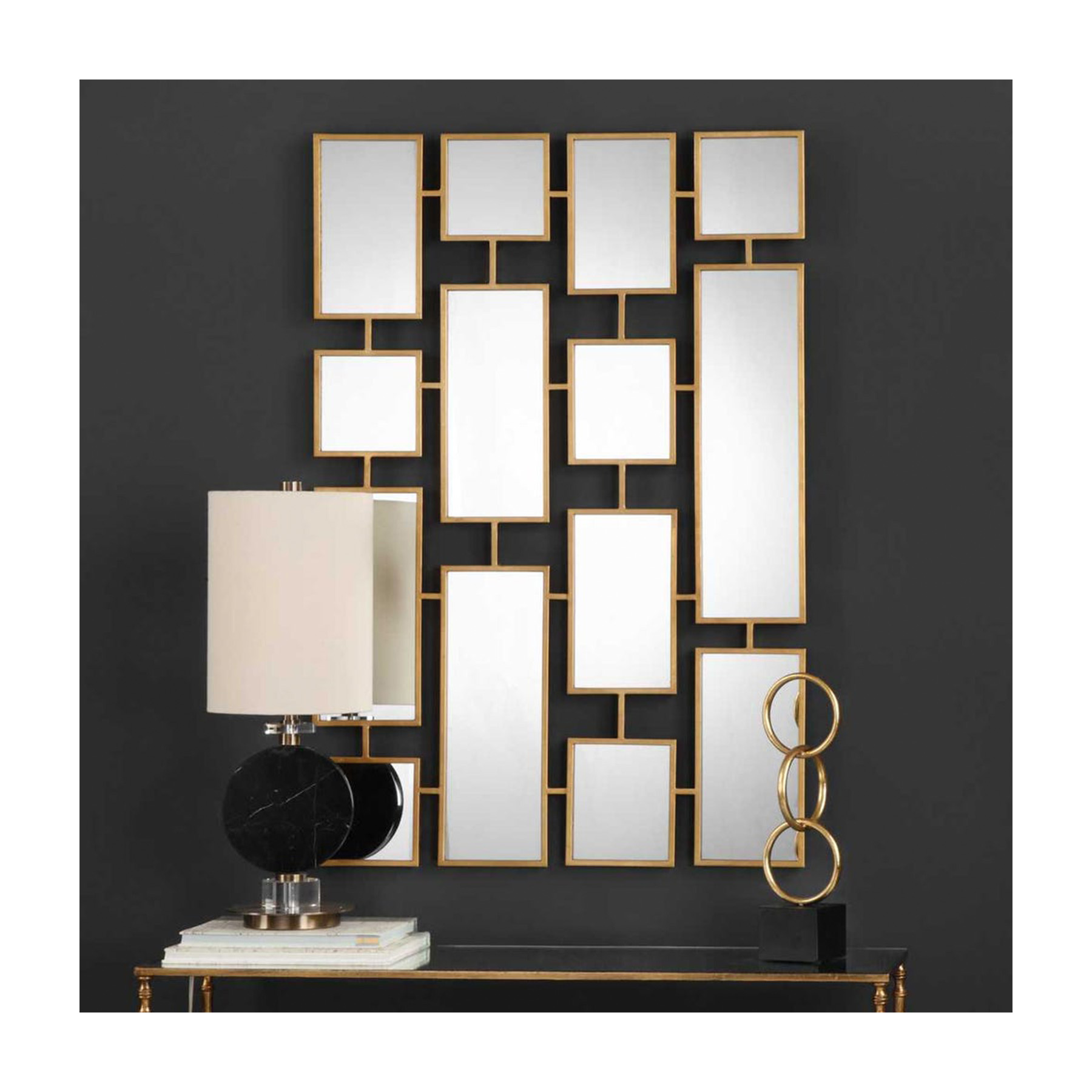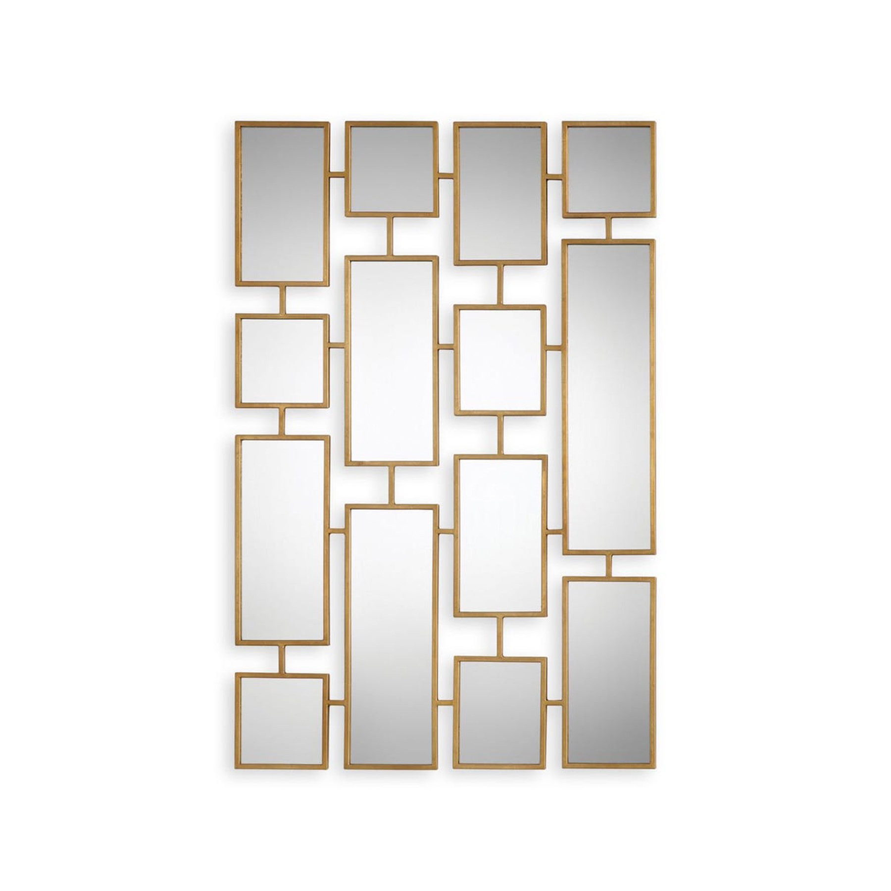 Craftily connected forged iron rectangles finished in a lightly antiqued gold leaf. May be hung horizontal or vertical.
