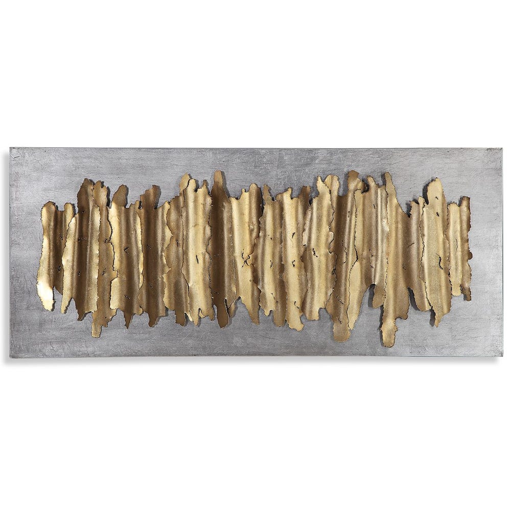 Iron wall art featuring layers of metal strips with crude edging, finished in an antique gold leaf and set on a distressed silver leaf iron backing. May be hung horizontal or vertical.