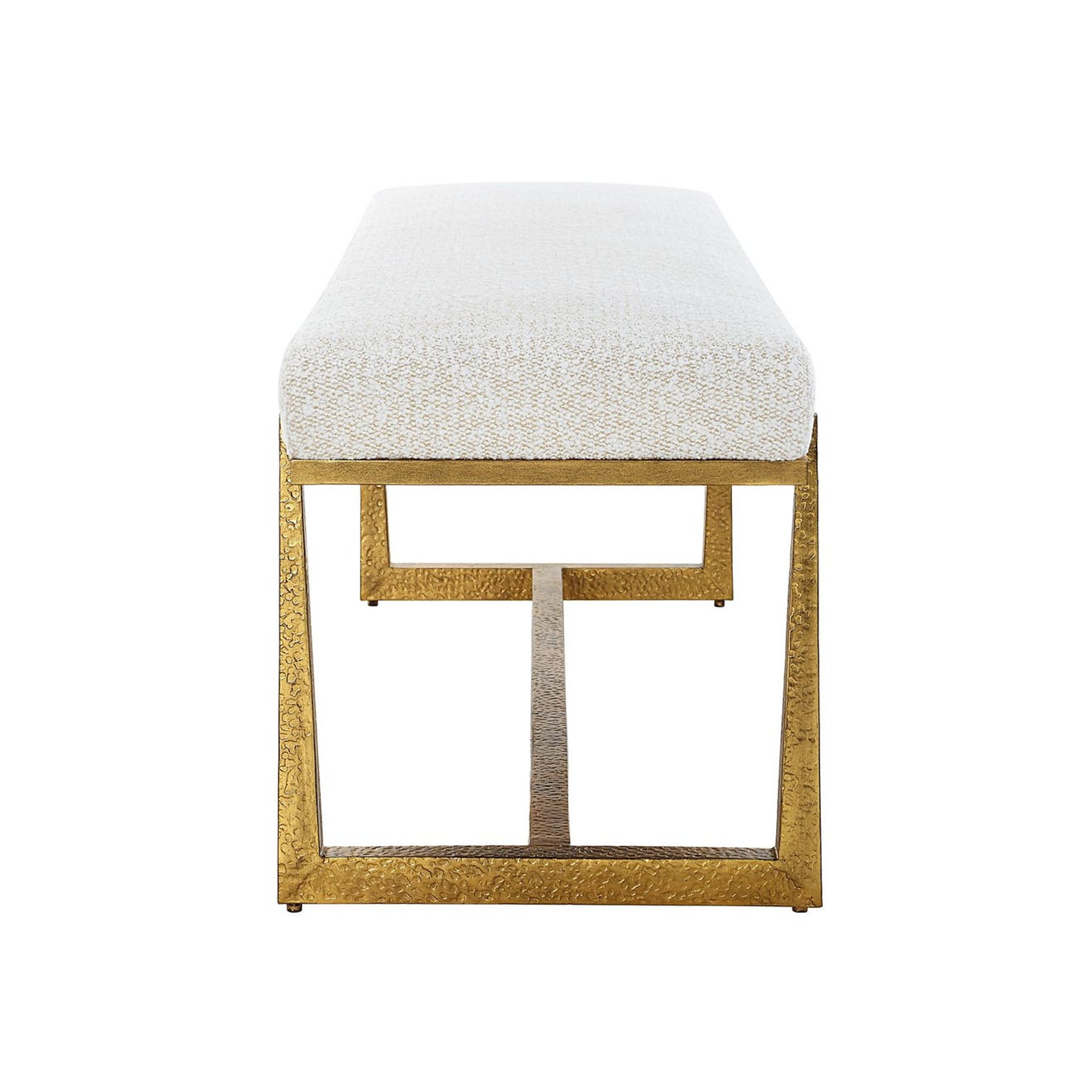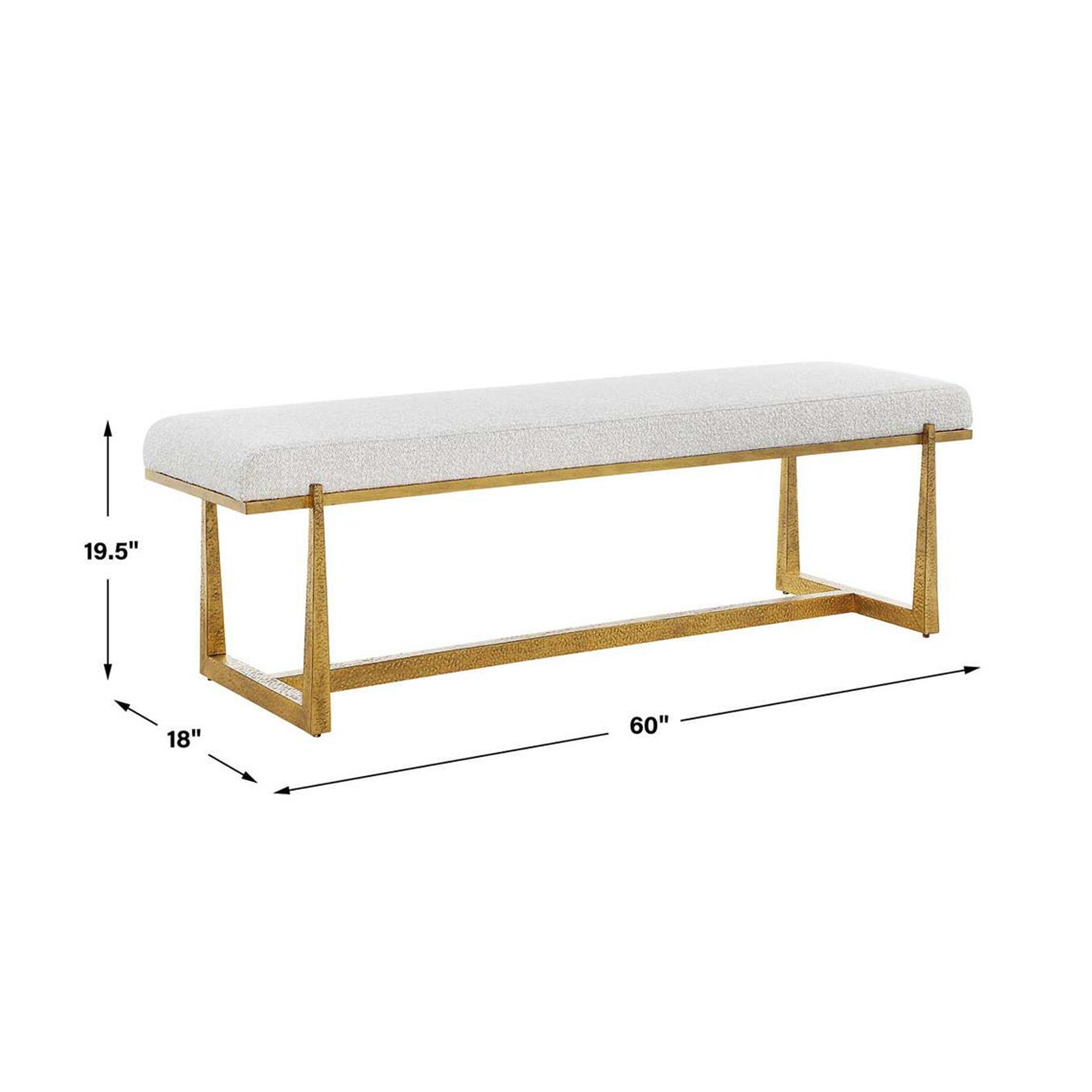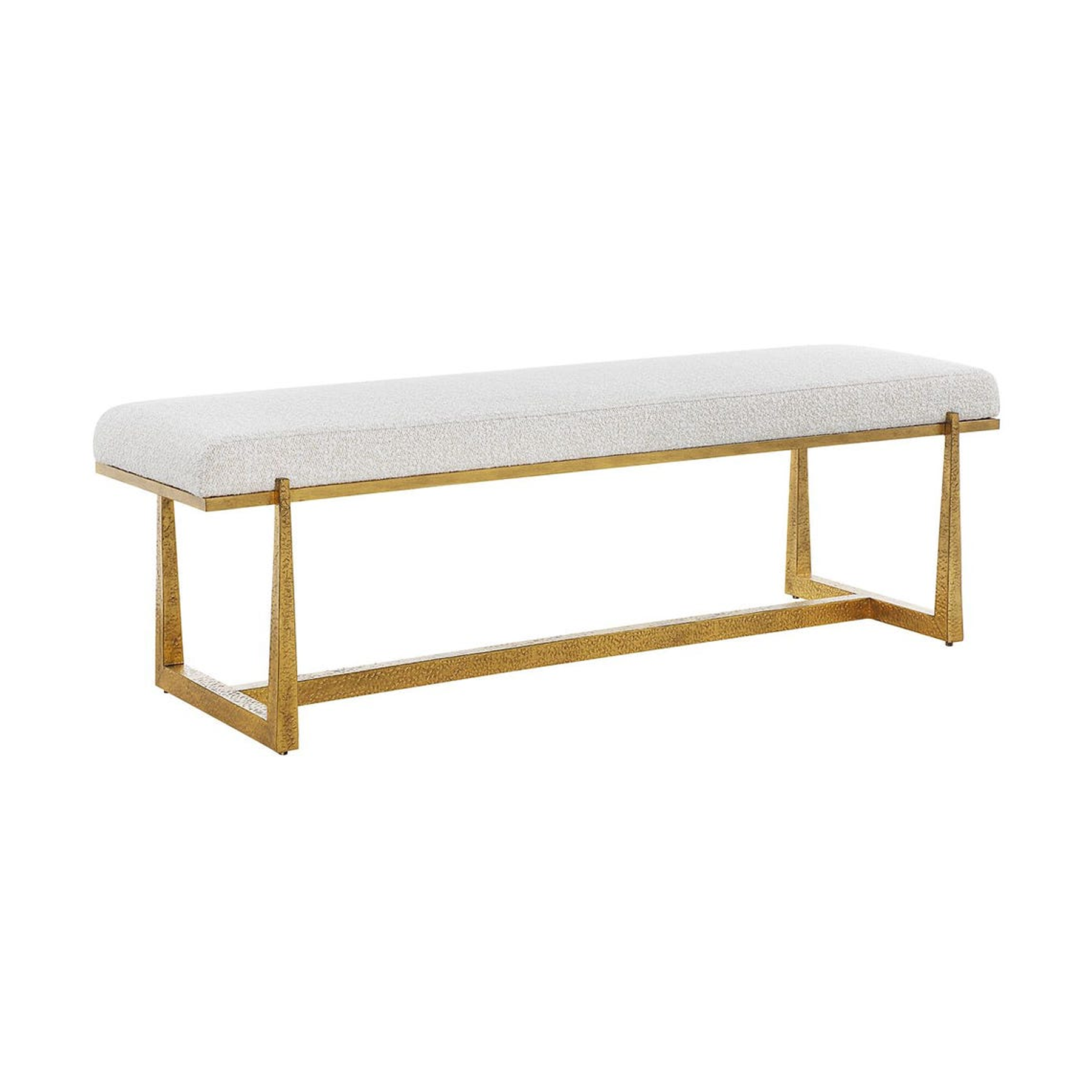 This elegant bench adds a touch of luxury to any room. The textured antique gold finish iron legs perfectly support and accentuate the upholstered top in a driftwood toned polyester blend with wool-like texture.
