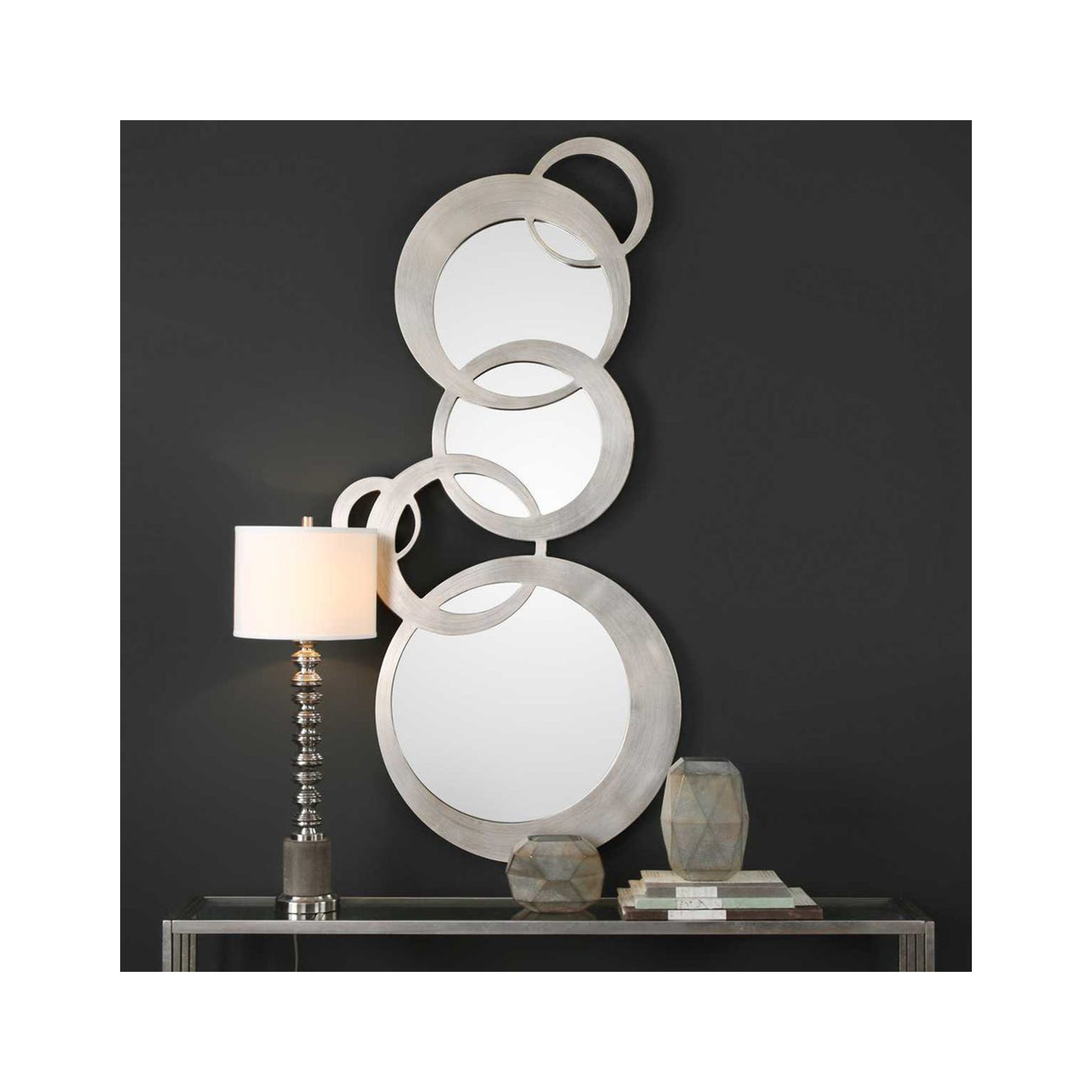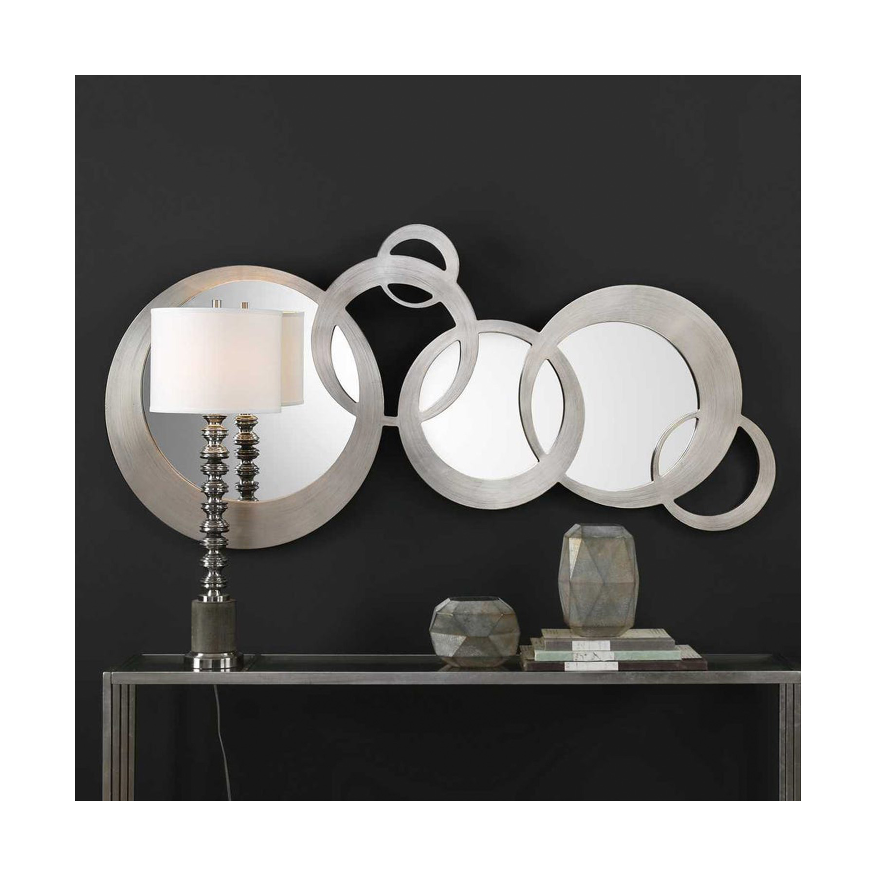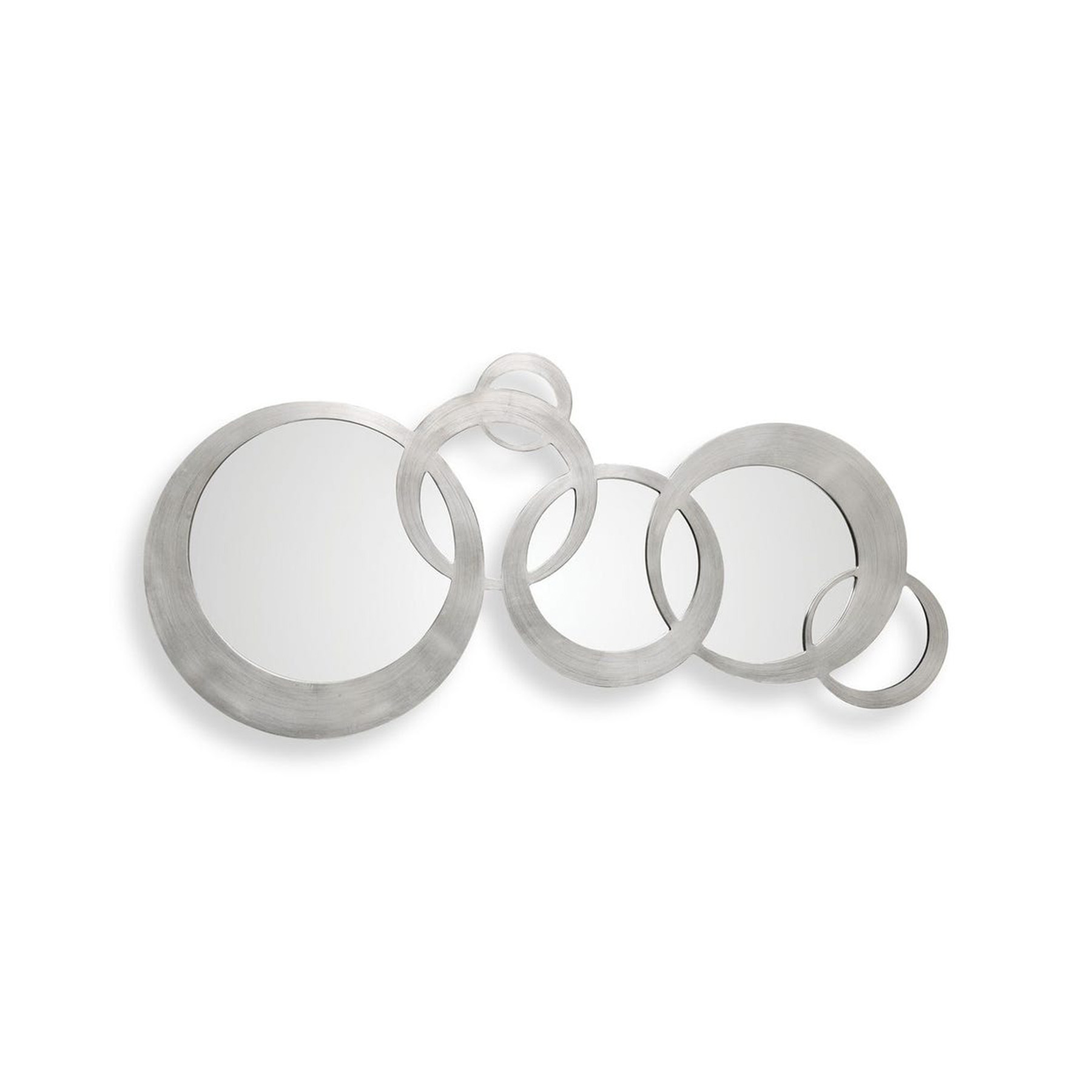 Solid wood frame, featuring a timeless contemporary design of linked, uneven rings, hand finished in a lightly antiqued silver leaf. May be hung horizontal or vertical.