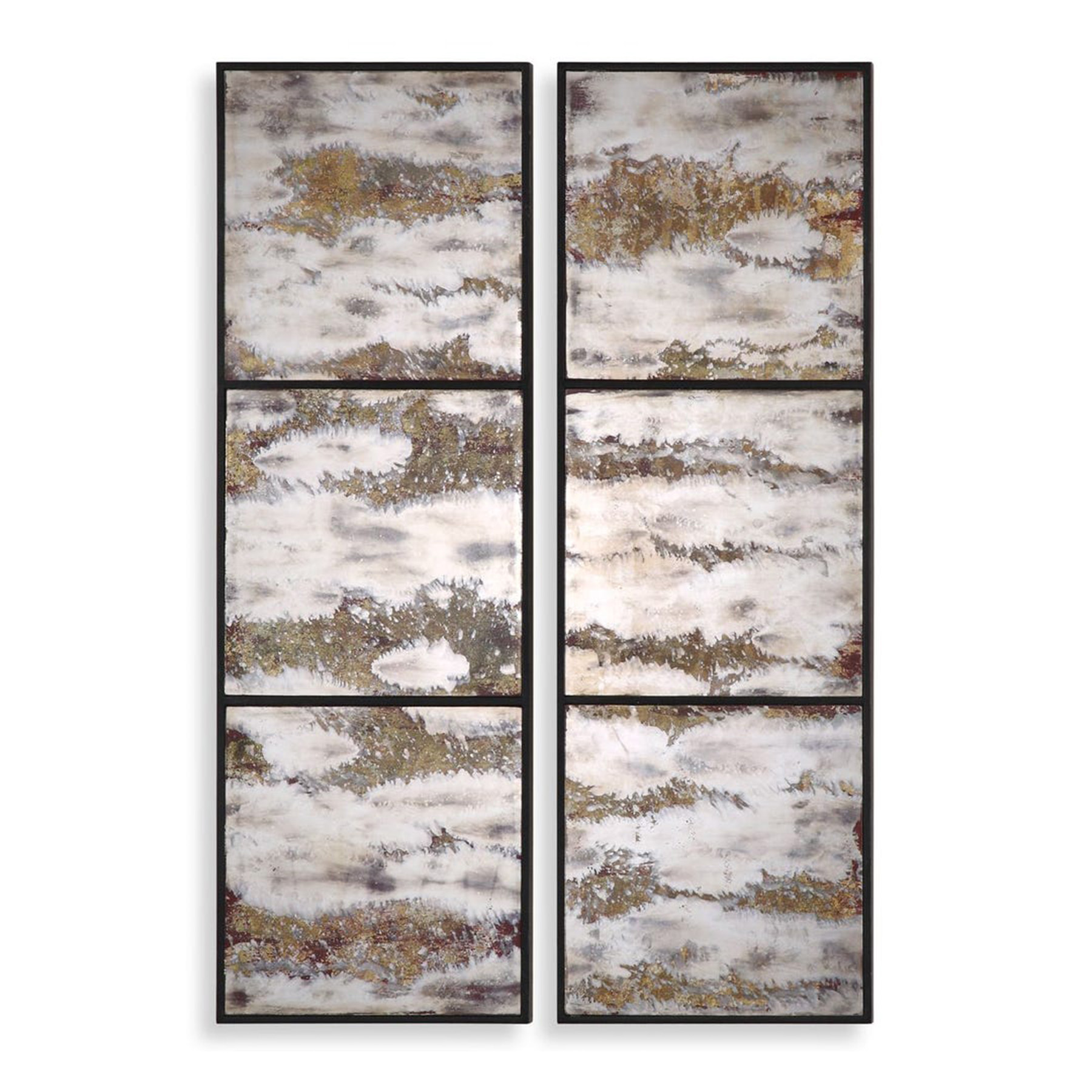 Each panel features three mirrors with a heavily oxidized, antiqued mirror in deep earth tones. May be hung horizontal or vertical.