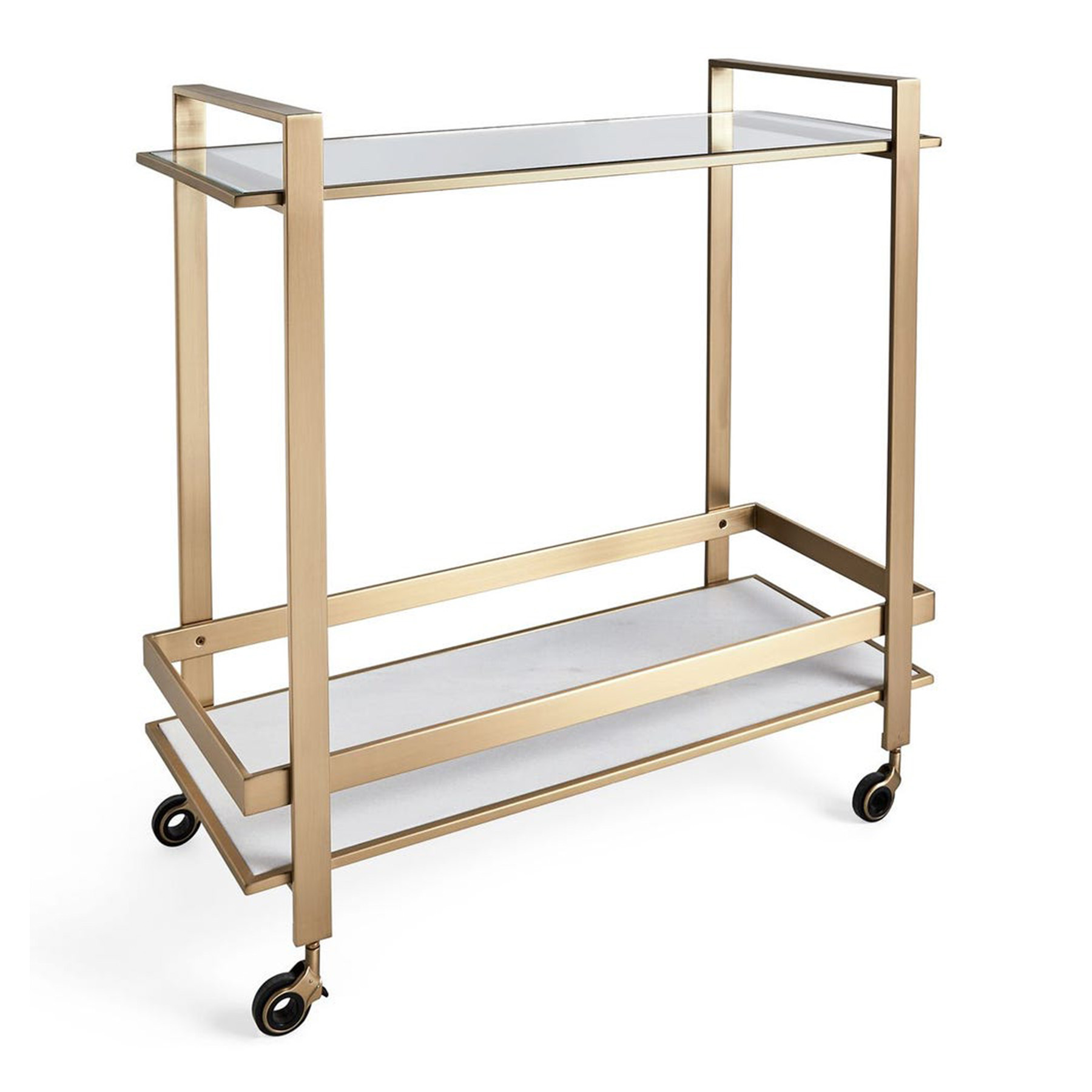 A rich brass finished frame holds both a clear glass top and a honed white marble base. The stylish, pierced wheels are easily navigable in all directions.