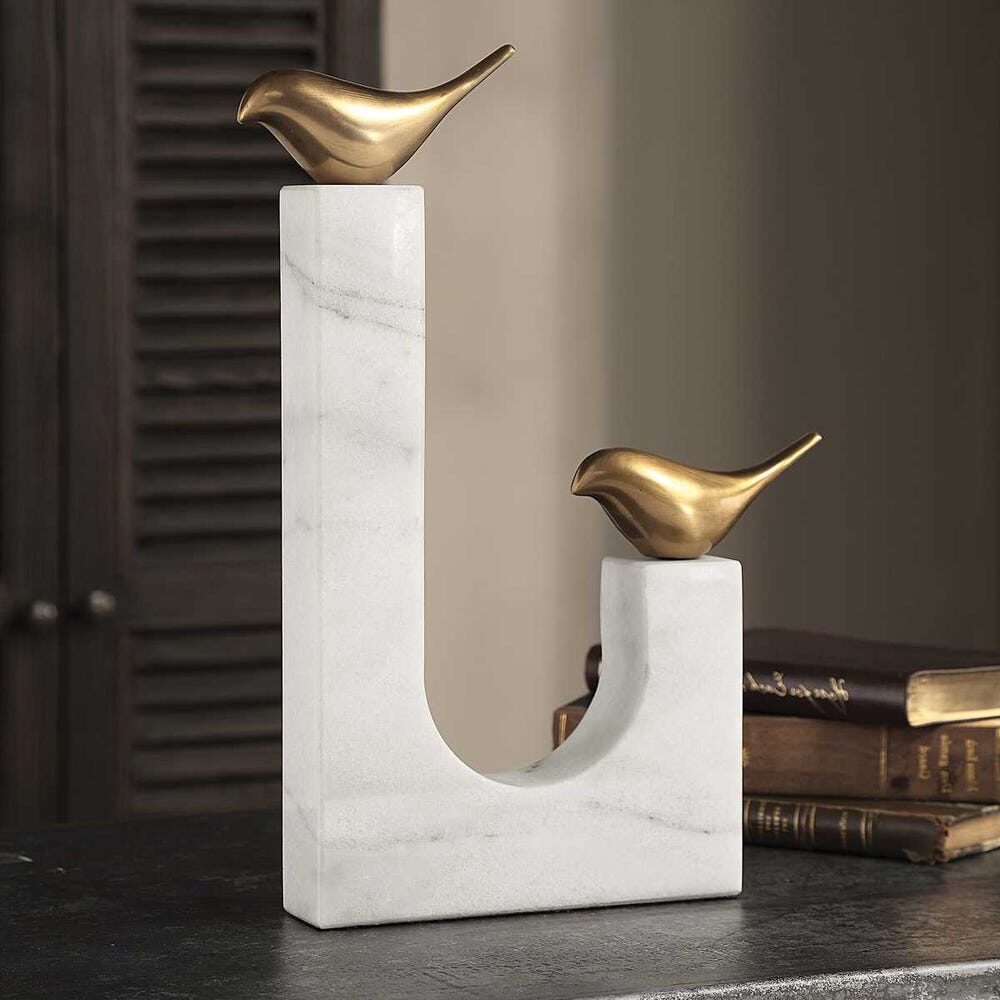 Two cast brass, stylized songbirds counterpoised on a white marble sling base. The warm patinated brass contrasts with the polished marble support, emphasizing balance, symmetry, and the sculptural quality of the piece