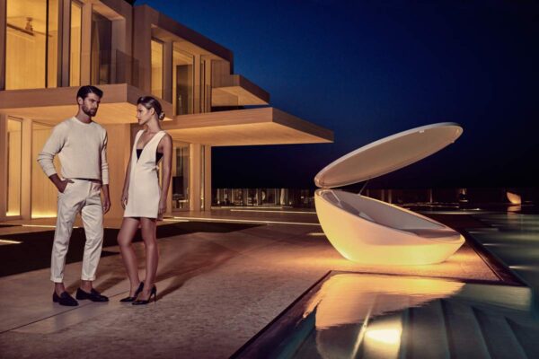 Enjoy shaded relaxation on the Ulm Daybed with Folding Canopy. This luxurious daybed features the collection’s signature smooth form and an integrated canopy for adjustable shade, perfect for sophisticated outdoor lounging.