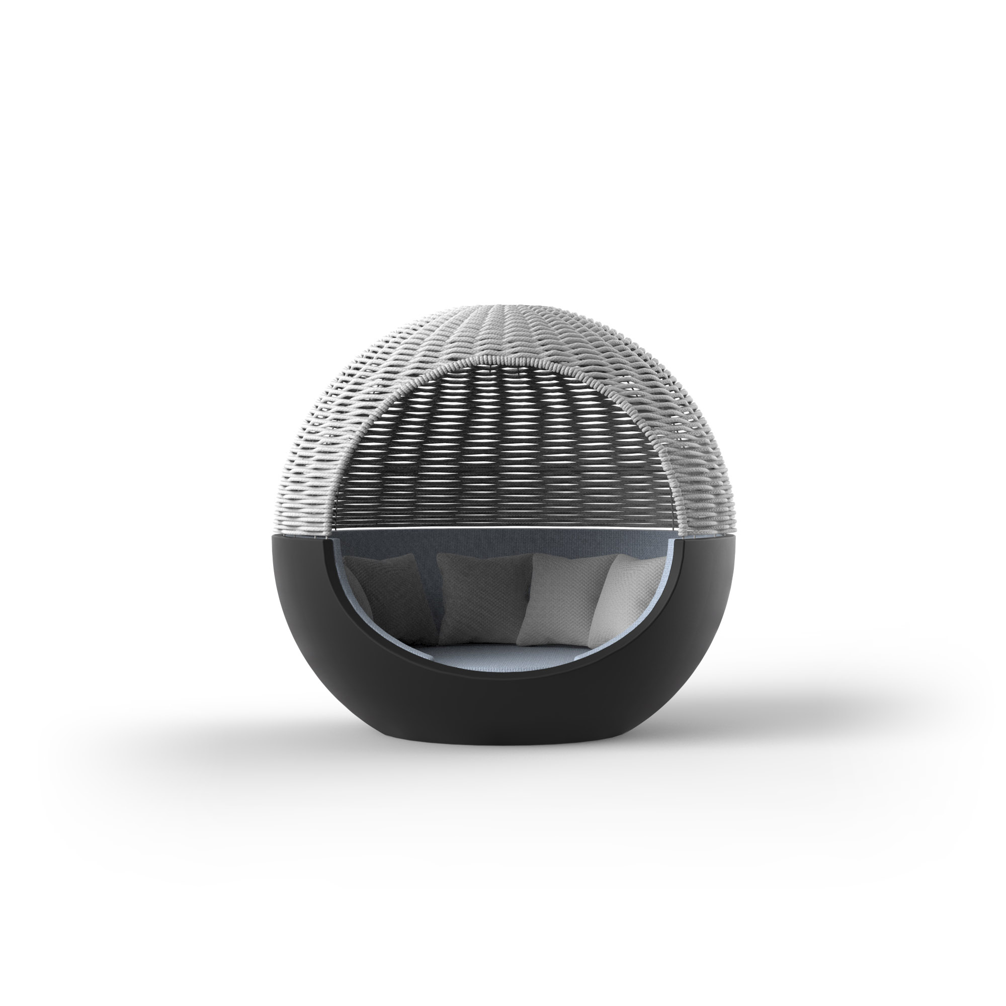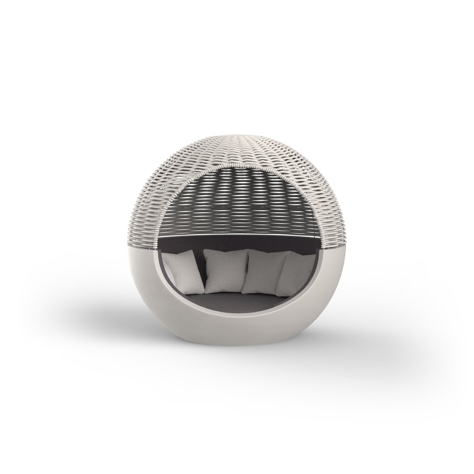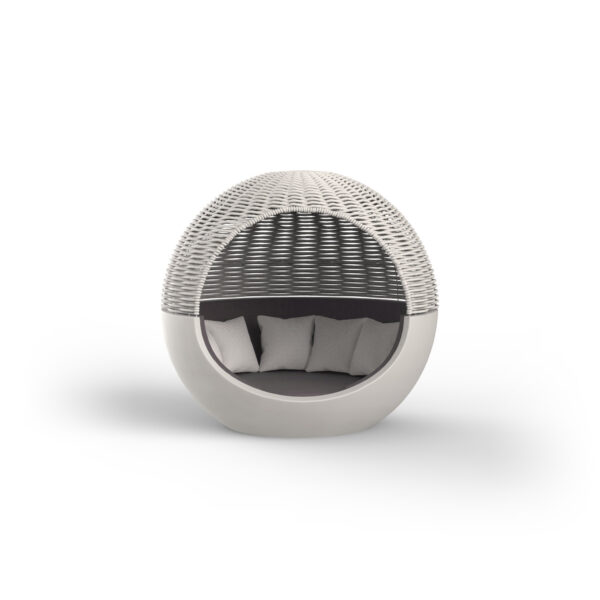 Create a unique outdoor oasis with the Ulm Moon Daybed featuring a Woven Rope Parasol. Its distinctive circular form and integrated, textured canopy provide a luxurious and artful spot for shaded relaxation in sophisticated contemporary style.