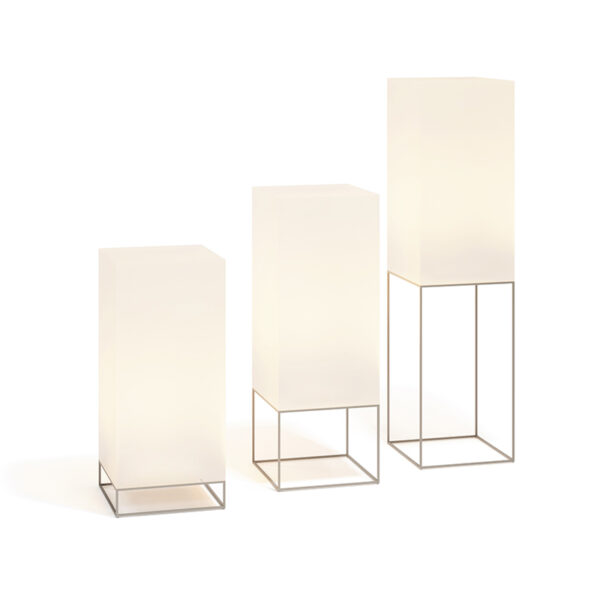 Make a dramatic lighting statement with the exceptionally tall Vela High Cube Lamp (40x40x152). Its imposing geometric form provides powerful illumination and a stunning sculptural presence outdoors.