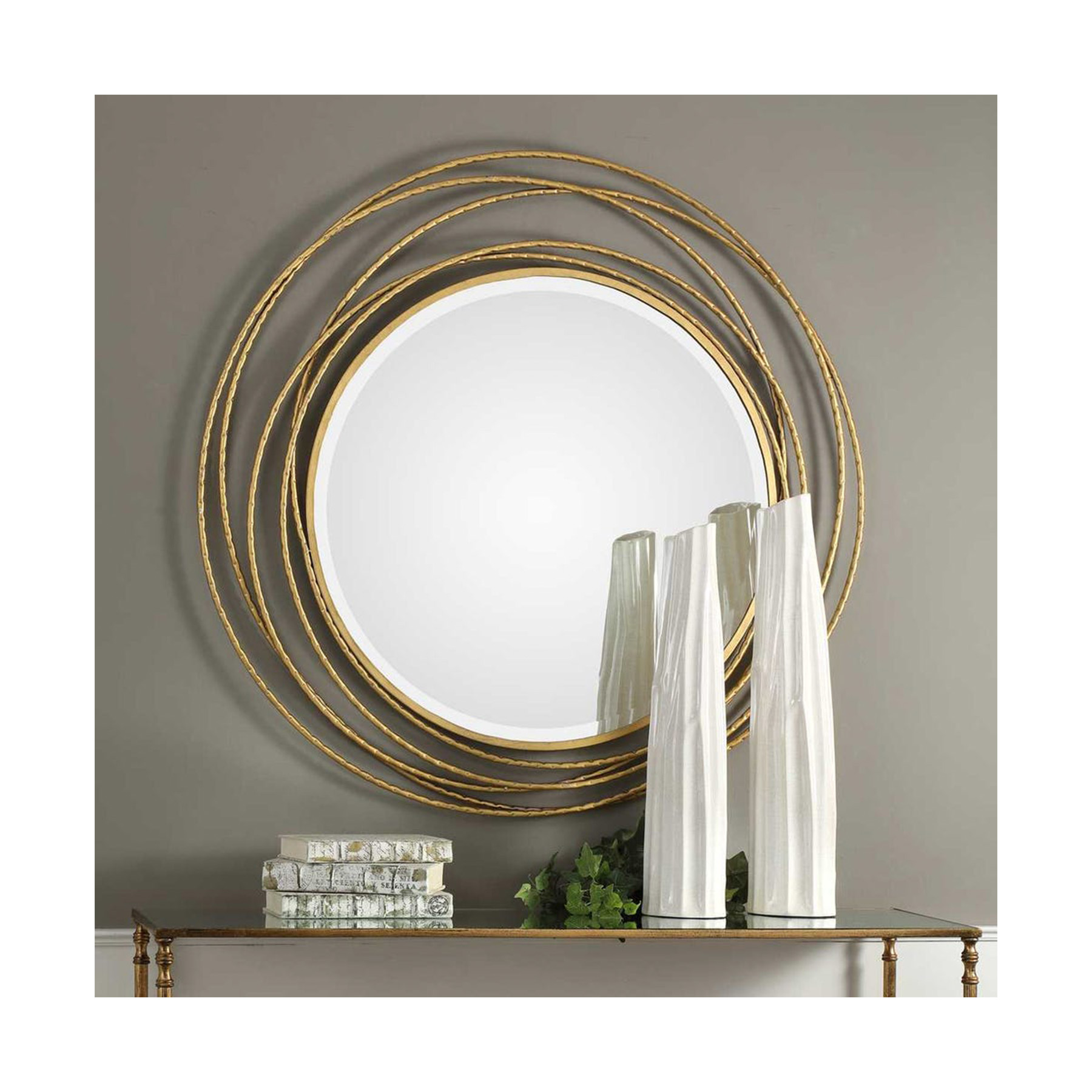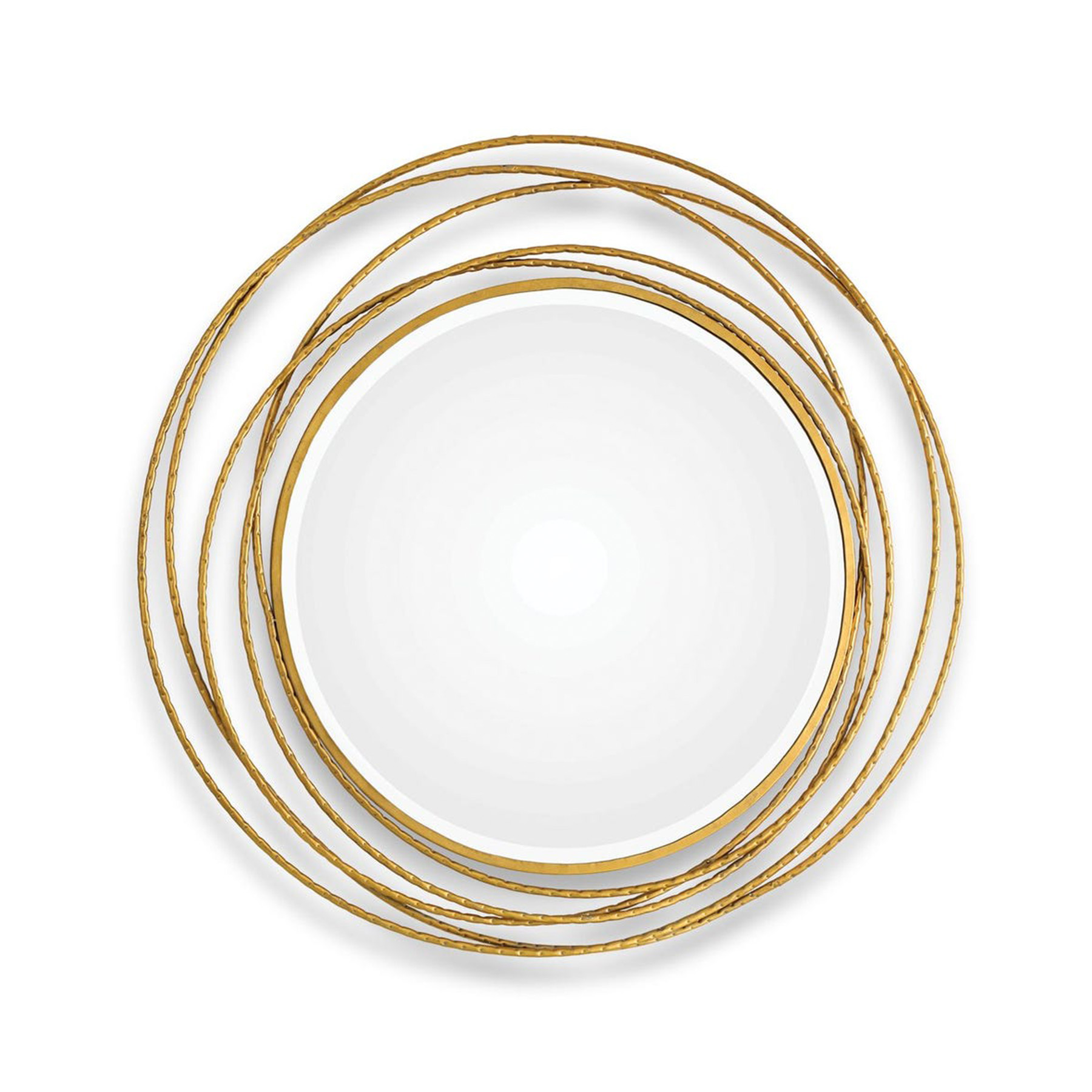 Hand forged iron coils, finished in a metallic gold leaf, accented with a subtle hammered texture. Mirror features a generous 1 1/4″ bevel.
