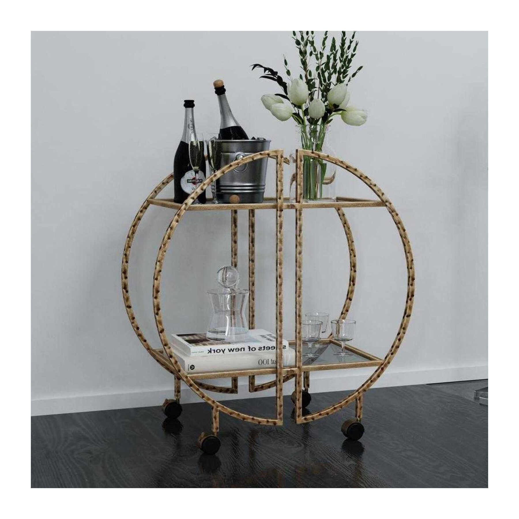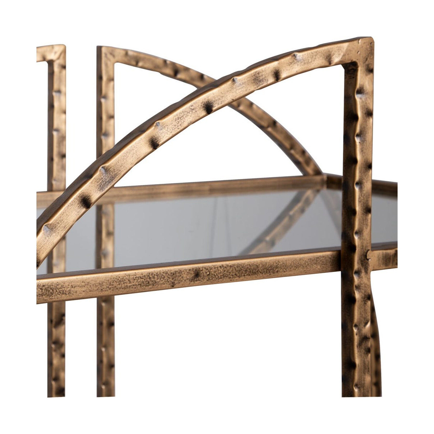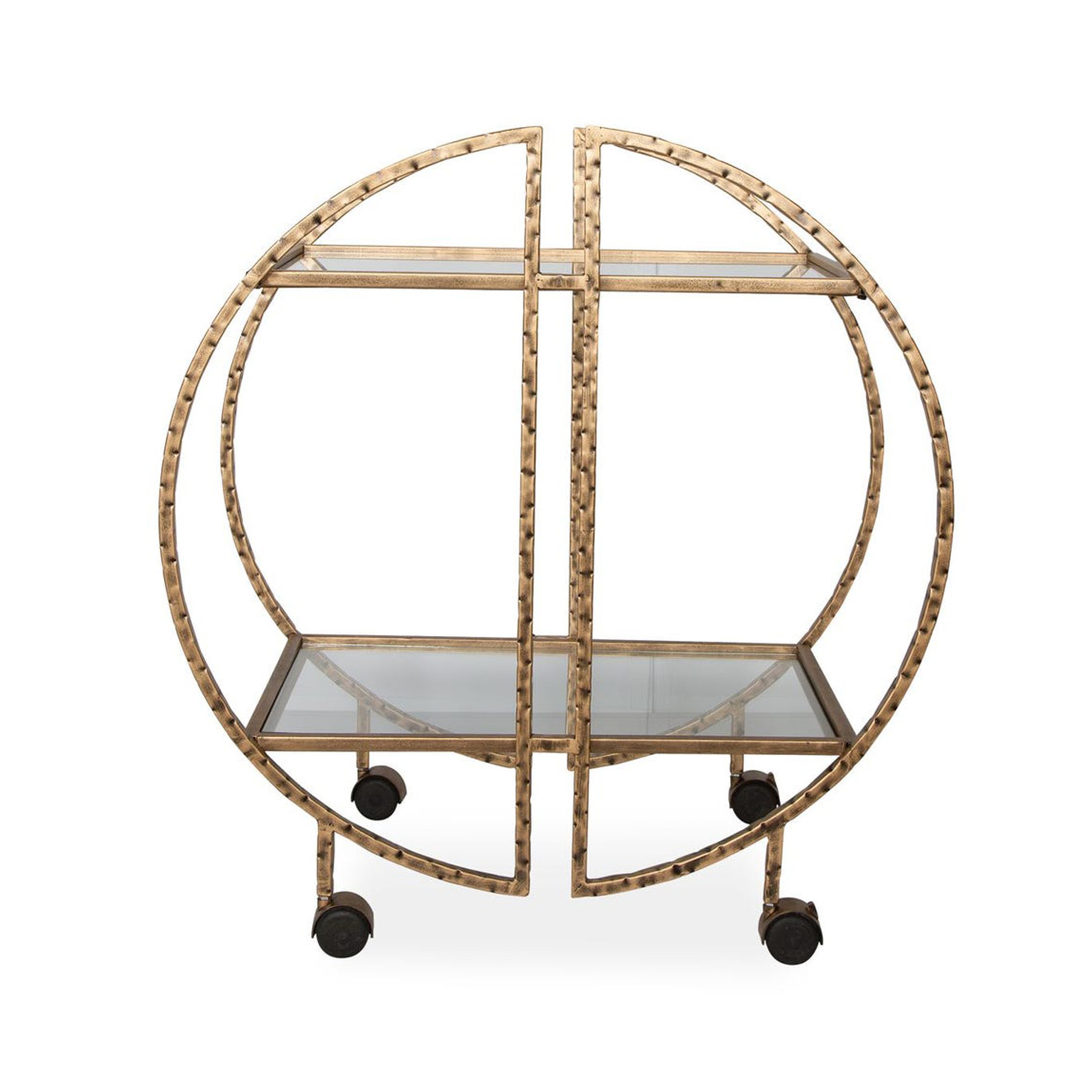 Featuring hand forged iron with hammered texturing in a heavily antique gold finish, this versatile bar cart reaches across many design styles. Includes two clear tempered glass shelves, complete with rolling casters.
